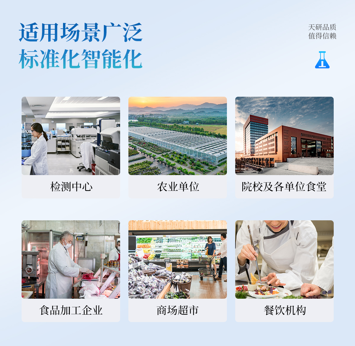 多功能食品安全檢測儀可快速檢測200多項目,包含非食用化學(xué)物質(zhì)、濫用食品添加劑、農(nóng)藥殘留、獸藥殘留、重金屬、病害肉、營養(yǎng)強化劑、抗生素類殘留、激素類殘留、真菌毒素類殘留、化學(xué)類殘留等現(xiàn)場的定性定量檢測。該多功能食品安全檢測儀為集成化食品安全快速檢測分析設(shè)備,廣泛應(yīng)用于市場監(jiān)管局、檢測中心、衛(wèi)生監(jiān)督部門、農(nóng)業(yè)部門、院校及各單位食堂、食品肉產(chǎn)品深加工企業(yè)、商超市場、司法部門、餐飲機構(gòu)、養(yǎng)殖場、屠宰場、檢驗檢疫部門等單位使用。