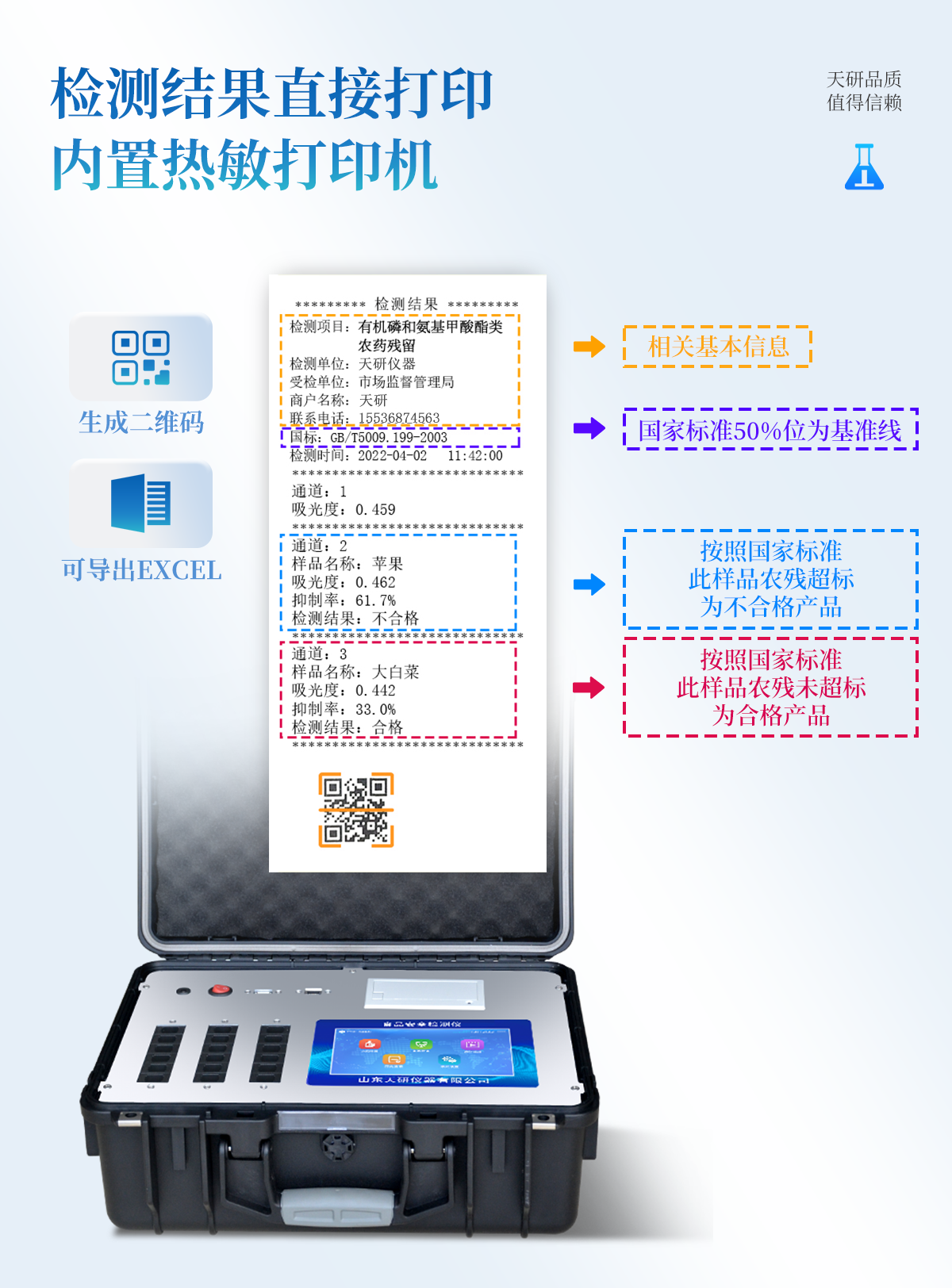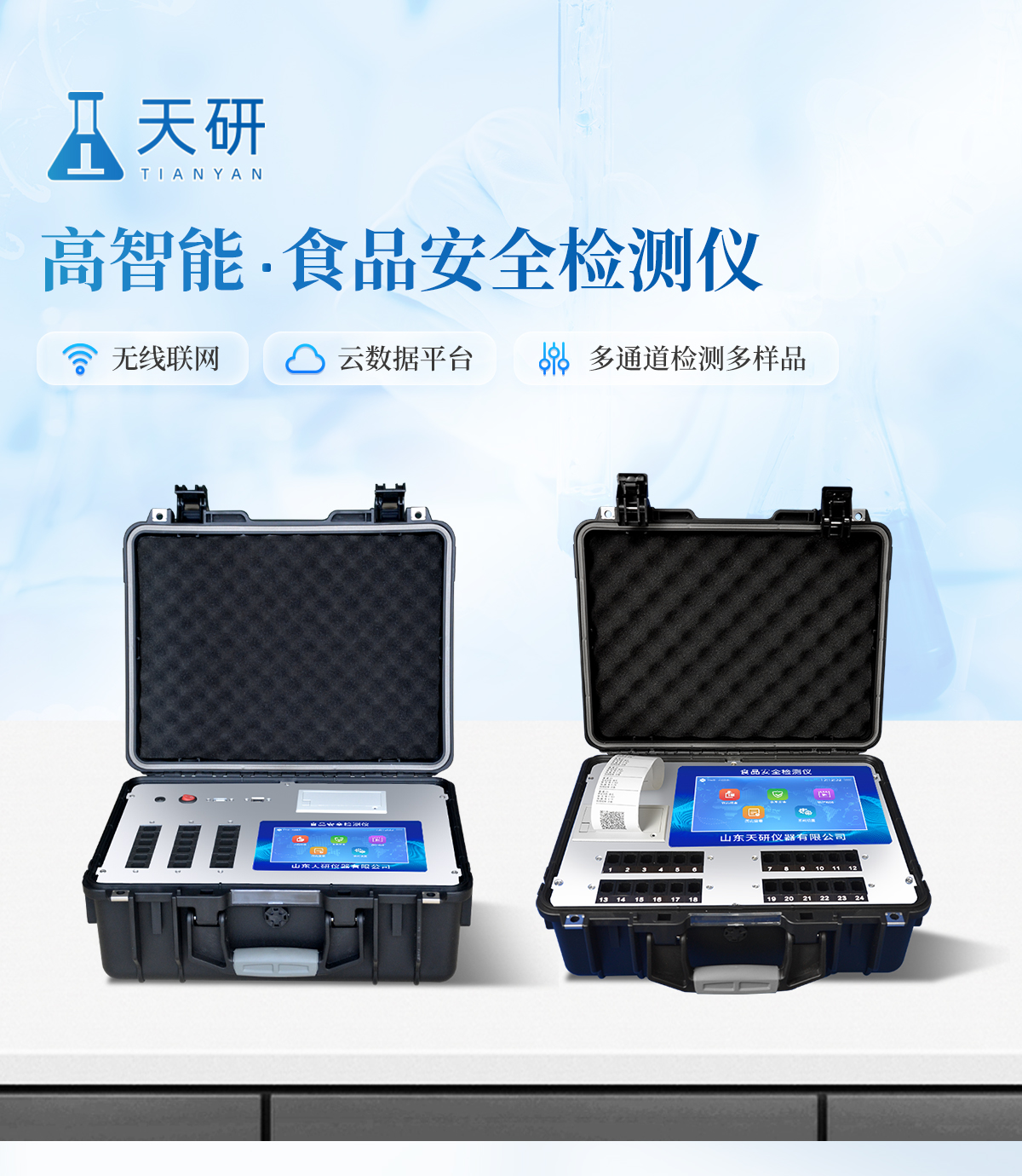 | 安卓智能操作系統(tǒng),采用更加**的UI交互界面,儀器具有wifi聯(lián)網(wǎng)上傳、4G聯(lián)網(wǎng)傳輸、GPRS無(wú)線遠(yuǎn)傳、網(wǎng)線連接功能,快速批量上傳數(shù)據(jù)。 | 智能化程度高,儀器具有自檢功能:具有開(kāi)機(jī)自檢和調(diào)零功能,具有自動(dòng)檢測(cè)重復(fù)性功能。 | 新一代高速熱敏打印機(jī),檢測(cè)完成可自動(dòng)打印或批量打印檢測(cè)報(bào)告和二維碼。 | 儀器帶有監(jiān)管平臺(tái),數(shù)據(jù)可局域網(wǎng)和互聯(lián)網(wǎng)數(shù)據(jù)上傳,檢測(cè)結(jié)果直接傳至食品安全監(jiān)管平臺(tái)。進(jìn)行區(qū)域食品安全監(jiān)管及大數(shù)據(jù)分析處理與數(shù)據(jù)統(tǒng)計(jì),檢測(cè)區(qū)域食品安全長(zhǎng)短期動(dòng)態(tài),達(dá)到食品安全問(wèn)題預(yù)估、預(yù)警 | 一體化主機(jī),包含食品安全檢測(cè)模塊、多通道農(nóng)藥殘留檢測(cè)模塊、膠體金免疫層析檢測(cè)模塊。 | 一體化便攜式快檢設(shè)備,滿足現(xiàn)場(chǎng)及流動(dòng)檢測(cè)使用需求,能夠在同一軟件下實(shí)現(xiàn)所有檢測(cè)項(xiàng)目的檢測(cè),并可通過(guò)同一窗口直觀顯示檢測(cè)結(jié)果。 | 膠體金模塊檢測(cè)方式:軌道式自動(dòng)傳輸掃描,檢測(cè)完成后自動(dòng)退出檢測(cè)卡。 | CT線自動(dòng)識(shí)別,無(wú)需手動(dòng)調(diào)整。 | 內(nèi)置強(qiáng)大的數(shù)據(jù)庫(kù),具有多品類多種類樣品菜單功能,可靈活選擇檢測(cè)樣品,不同的檢測(cè)通道可同時(shí)檢測(cè)不同的樣品項(xiàng)目。也可在儀器上直接編輯錄入樣品名稱、檢測(cè)指標(biāo)、送檢單位等信息并保存進(jìn)樣品數(shù)據(jù)庫(kù)。 | 產(chǎn)品內(nèi)置操作演示視頻,是您身邊的化驗(yàn)指導(dǎo)專家。 | 樣品處理簡(jiǎn)單省力,整體操作快速、安全、便捷。 | 儀器具有自身保護(hù)功能,可設(shè)置用戶名及密碼,防止非工作人員操作等。 | 高靈敏度,高檢測(cè)精度,高重復(fù)性精度,掃描式高精度光學(xué)傳感器。 | 結(jié)果判定線可修改,對(duì)照值標(biāo)定值可保存,斷電不丟失數(shù)據(jù)。 | 兼容市場(chǎng)上所有的膠體金卡,使用耗材不受限制,極大增強(qiáng)用戶使用體驗(yàn)。 | 儀器具有重新校準(zhǔn)、鎖定、恢復(fù)出廠設(shè)置功能。 |