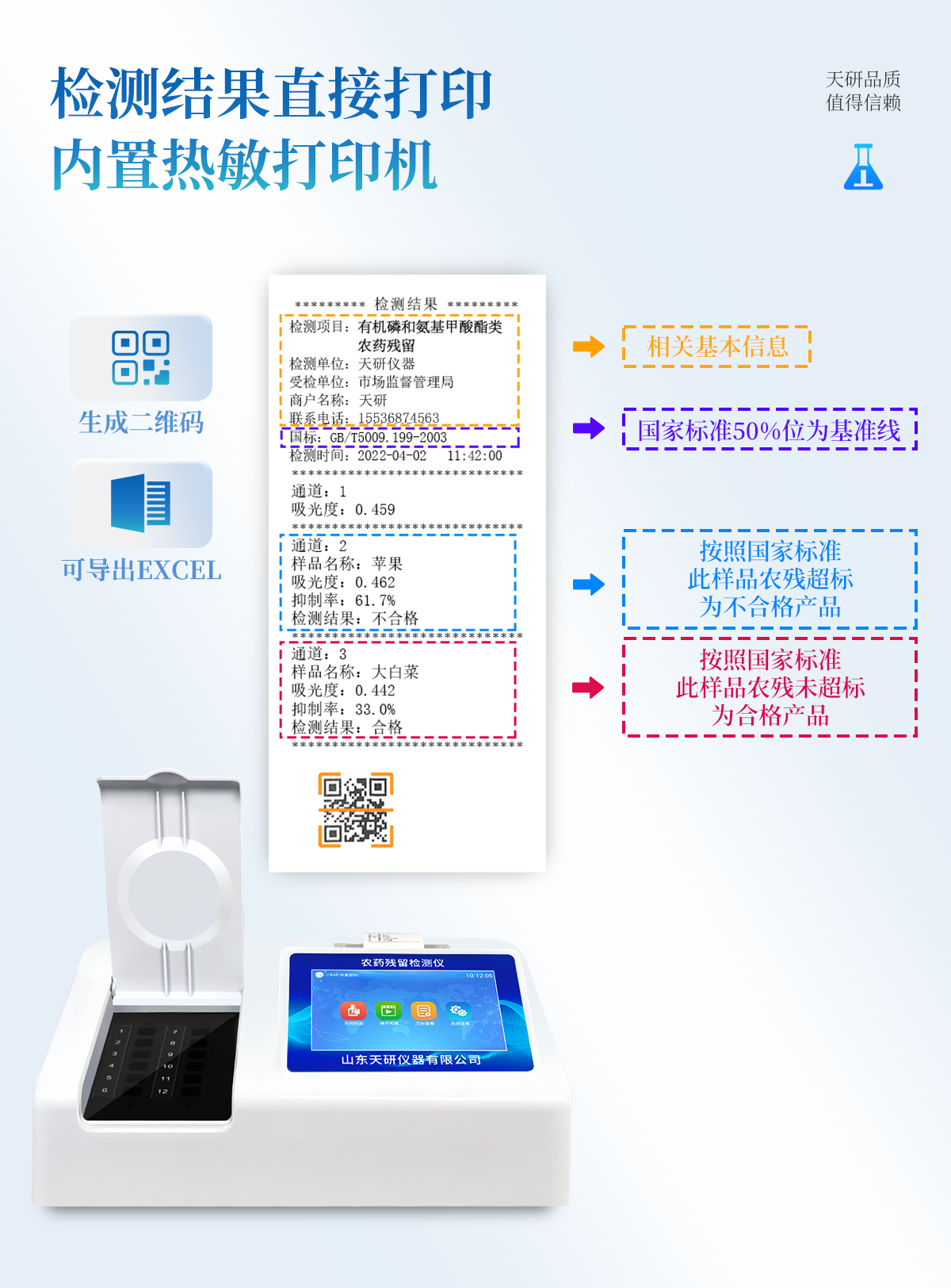 | 乙酰膽堿酯酶和丁酰膽堿酯酶試劑均可以使用,符合國家標(biāo)準(zhǔn)和農(nóng)業(yè)部標(biāo)準(zhǔn)的要求。 | 自動判斷樣品是否合格,檢測結(jié)果更加直觀。 | 儀器具有100多種蔬菜名稱菜單庫,分類管理,并可按需添加或刪除蔬菜名,編輯蔬菜名稱,可直接打印出蔬菜名稱。 | 檢測通道:24個檢測通道,可以同時測試多個樣品,循環(huán)檢測,即放即檢,每個樣品由程序控制分別獨(dú)立工作,不會互相干擾。 | 智能操作系統(tǒng),采用更加人性化操作,主控采用多核處理器,主頻1.88Ghz,運(yùn)轉(zhuǎn)速度更快速,穩(wěn)定性更強(qiáng)。 | 顯示方式:7英寸高靈敏真彩觸摸屏顯示,人性化中文操作界面,讀數(shù)直觀、簡單。 | 打印機(jī)采用串口5v打印,可選擇手動打印或者自動打印,三分鐘出打印結(jié)果,打印格式為檢測人姓名、吸光度差值、檢測時間、檢測機(jī)構(gòu)、樣品名稱及結(jié)果判定。 | 光源采用進(jìn)口超高亮發(fā)光二極管,具有低功耗、高精度、穩(wěn)定性強(qiáng)、光源可控可以關(guān)掉不使用的光源,響應(yīng)速度快等優(yōu)點(diǎn)。 | 智能恒流穩(wěn)壓,光強(qiáng)自動校準(zhǔn),長時間連續(xù)工作光源無溫漂現(xiàn)象。 | 儀器具有GPRS遠(yuǎn)傳功能,可插手機(jī)卡實(shí)現(xiàn)數(shù)據(jù)遠(yuǎn)傳平臺,wifi聯(lián)網(wǎng)功能,可將數(shù)據(jù)快速上傳電腦,進(jìn)行數(shù)據(jù)管理與統(tǒng)計。 | 采用USB2.0接口設(shè)計,方便數(shù)據(jù)的存貯和移動,并可隨時與計算機(jī)直接相連,并且可用計算機(jī)控制儀器。實(shí)現(xiàn)數(shù)據(jù)查詢、瀏覽、分析、統(tǒng)計、打印等。 | 智能化程度高,儀器具有自檢功能:具有開機(jī)自檢和調(diào)零功能,具有自動檢測重復(fù)性功能 | 儀器具有自身保護(hù)功能,可設(shè)置用戶名及密碼,防止非工作人員操作等。 | 采用DC12v直流供電,安全系統(tǒng)更高,并且配備6A鋰電池充電器。 | 儀器具有重新校準(zhǔn)、鎖定、恢復(fù)出廠設(shè)置功能。 |
