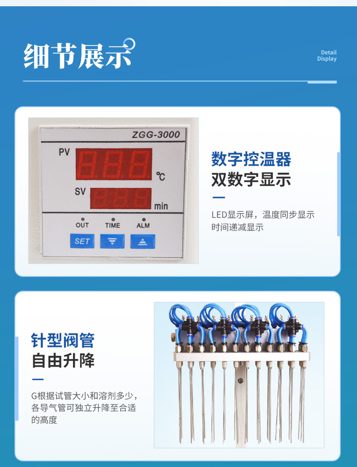 | 分配室上各氣針通道可組合使用或單獨使用,每一路氣針均可單獨開關(guān)。分配室的高度可視需要調(diào)節(jié)。 | 每一路氣體流量可單獨進行調(diào)節(jié),克服了不可調(diào)氮吹儀各氣路氣流量大小不一的弱點。 | 數(shù)字溫控器,雙數(shù)字顯示. | 可能與溶劑接觸的部件均采用不銹鋼材料、合金鋁并表面進行塑料噴涂,使用壽命長且清潔方便。 | 整機可放入通風櫥中使用。 | 一般標配的加熱塊規(guī)格為孔徑∮16mm。 |