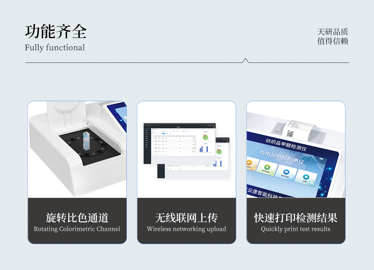 該紡織品甲醛檢測系統(tǒng)與質檢、商檢機構采用同樣執(zhí)行標準、檢測方法,專業(yè)為廣大紡織品、服裝等生產(chǎn)企業(yè)、質檢商檢單位提供“一站式服務”,同時為各類紡織品甲醛實驗室提供專業(yè)的解決方案。