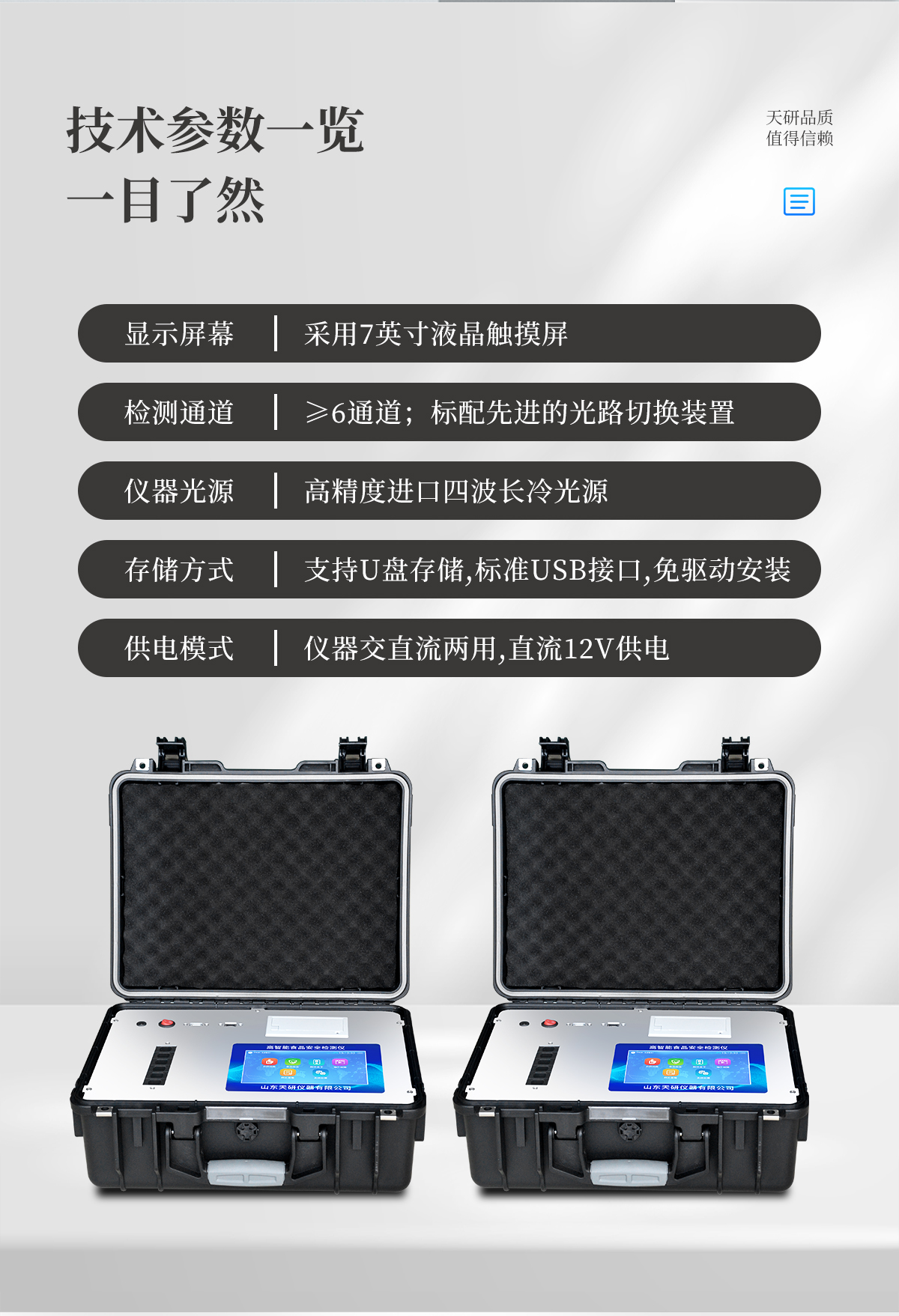 | 儀器采用手提式一體化系統(tǒng)檢測技術(shù),將分光光度模塊、新型農(nóng)殘檢測模塊、數(shù)字化管理模塊、無線通訊模塊高度集成于一體,支持檢測200種食品安全檢測項目,同時預(yù)留升級檢測方法。 | 儀器檢測模塊標(biāo)準(zhǔn)化、智能化,檢測項目可隨意自由組合。檢測箱體內(nèi)置多個標(biāo)準(zhǔn)檢測單元,檢測模塊可以調(diào)整配置。 | 顯示屏幕:儀器采用10.1英寸豎向液晶觸摸屏顯,搭配運行安卓智能操作系統(tǒng),主控芯片采用ARM Cortex-A7,RK3288/4核處理器,主頻1.88Ghz,操作方便,性能更強。 | 檢測通道:≥12通道;采用精密旋轉(zhuǎn)比色池設(shè)計,使用同芯片同光源校準(zhǔn)精度,解決不同光源之間的誤差值,更加準(zhǔn)確**。(1-12通道間誤差0.1%,專利號:ZL202022821055.2) | 儀器光源:高精度進口四波長冷光源,每個通道均配置 410、520、590、630nm 波長光源,標(biāo)配**的光路切換裝置,專利光路切換功能可實現(xiàn)64波長,并且所有檢測項目可實現(xiàn)所有通道同時檢測。 | 設(shè)備可一鍵校準(zhǔn),自動保存校準(zhǔn)數(shù)據(jù),自動對比校驗,得到精準(zhǔn)光源,采用Android SP存儲數(shù)據(jù),光源數(shù)據(jù)永不丟失,方便每一次使用。 | 通訊接口:配備無線通信模塊、4G(APN)通訊模塊、藍牙傳輸,同時具有雙USB接口以及RJ45網(wǎng)線接口,可以多方式實現(xiàn)數(shù)據(jù)保存及數(shù)據(jù)傳輸 | 存儲方式:支持U盤存儲,標(biāo)準(zhǔn)USB接口,免驅(qū)動安裝。檢測結(jié)果存儲容量20萬條以上,可生成Excel表格進行拷貝,并具有登錄保護功能。 | 智能化操作系統(tǒng): | 1)操作系統(tǒng):儀器可在同一檢測界面自動對應(yīng)相關(guān)檢測通道,一次性選擇1-12個樣品名稱,無需退出界面,節(jié)省操作時間。并可以對每個通道屬性和樣品信息單獨進行編輯,例如送檢單位、人員,檢測人員等,打印時勾選打印顯示。 | 2)數(shù)據(jù)集成系統(tǒng):設(shè)備首頁自動匯總分析檢測數(shù)據(jù),包含:周檢測數(shù)據(jù)、月檢測數(shù)據(jù),全部檢測總數(shù)量,均包含檢測總數(shù),合格數(shù),不合格數(shù),以及相關(guān)柱形分析圖,各項檢測數(shù)據(jù)一目了然,無需電腦查詢,更加快捷直觀。 | 3)數(shù)據(jù)庫系統(tǒng):十幾項數(shù)據(jù)庫分類管理儀器:包含項目類型、項目數(shù)據(jù)、檢測數(shù)據(jù)、歷史記錄、國標(biāo)信息、曲線信息、采樣信息、檢測信息、受檢信息、復(fù)核信息、圖表信息、光源校準(zhǔn)信息、打印樣式信息、樣品庫信息等等,數(shù)據(jù)庫之間互相協(xié)調(diào)聯(lián)動保證數(shù)據(jù)的真實完整性。同時產(chǎn)品數(shù)據(jù)庫以及歷史檢測記錄支持一鍵檢索功能。 | 4)限量規(guī)判系統(tǒng):具有限量查詢、添加物質(zhì)合規(guī)判定系統(tǒng)。檢測出結(jié)果后,系統(tǒng)自動調(diào)用系統(tǒng)數(shù)據(jù)庫中相關(guān)國標(biāo)進行比對判定,客觀顯示判定結(jié)果是否合格。 | 5)項目預(yù)設(shè)系統(tǒng):儀器具有任務(wù)預(yù)設(shè)模塊,一鍵提前預(yù)設(shè),給出方便快捷的新檢測方案,每一個任務(wù)分別可以設(shè)置不同的樣品、批次、編號、來源、備注、抽樣信息、檢測信息、受檢信息、復(fù)核信息等更多信息。樣品送檢時一鍵調(diào)取保存信息,并可多次調(diào)取,大大提高檢測效率。 | 6)數(shù)據(jù)監(jiān)管系統(tǒng):同步對接監(jiān)管平臺,數(shù)據(jù)可局域網(wǎng)和互聯(lián)網(wǎng)數(shù)據(jù)上傳,檢測結(jié)果可選擇直接傳至食品安全監(jiān)管平臺。進行區(qū)域食品安全監(jiān)管及大數(shù)據(jù)分析處理與數(shù)據(jù)統(tǒng)計,檢測區(qū)域食品安全長短期動態(tài),達到食品安全問題預(yù)估、預(yù)警。 | 7)打印系統(tǒng):內(nèi)置全新打印機,新創(chuàng)自定義打印方式,可按需靈活勾選控制:產(chǎn)品合格證(國家農(nóng)業(yè)部標(biāo)準(zhǔn)要求),二維碼,抽樣信息、檢測信息,受檢信息、復(fù)核信息、抽樣日期、檢測日期等信息的打印。 | 供電模式:儀器交直流兩用,直流12V供電,可連接車載電源,可配6ah大容量充電鋰電池,電量可實時顯示,方便戶外流動測試。 | 膠體金檢測模塊:采用雙通道CMOS成像處理技術(shù)及膠體金免疫層析技術(shù),可同時讀取雙膠體金卡數(shù)據(jù),自動采集、處理分析,將檢測結(jié)果顯示,并可根據(jù)參考限值自動判斷檢測結(jié)果,可檢測常見的獸藥殘留、生物毒素、抗生素、違禁添加物等。 | 1)探測技術(shù):CMOS成像探測; | 2)檢測通道:1個通道; | 3)檢測方式:消線法和比色法; | 4)顯示模式:陰性或陽性; | 5)曲線形式:軌道式掃描方式,顯示金標(biāo)卡圖像,實時生成、識別CT曲線圖,無需手動調(diào)整,完成檢測后自動退出檢測卡。兼容市場上其他金標(biāo)卡,使用耗材不受限制。 | 儀器加入遠程升級功能,可定向分客戶分儀器更新,開機后自動更新,客戶無需任何操作,即可升級全新項目。做到了無需退換機器即可實現(xiàn)實時遠程升級檢測儀器。 |