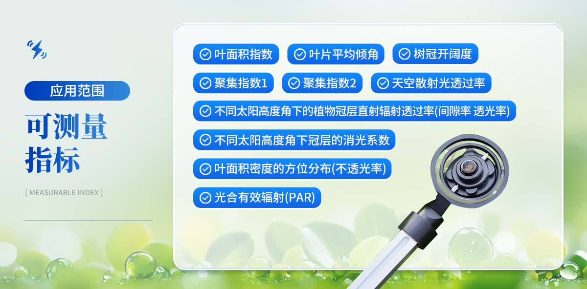 | 魚眼鏡頭可自動保持水平狀態(tài):專門為植物冠層結(jié)構(gòu)測量設(shè)計的小型魚眼攝像鏡頭安裝在手持式萬向平衡接頭上,可自動保持鏡頭處于水平狀態(tài),無需三角架; | 魚眼鏡頭可以伸入至冠層中:鏡頭安裝在搖臂一端,由于小巧和帶有測量桿,可以方便地水平向前或垂直向上伸入到冠層不同高度處,快速地進(jìn)行分層測量,測出群體內(nèi)光透過率和葉面積指數(shù)垂直分布圖; | 圖像分析軟件:圖像分析軟件可以任意定義圖像分析區(qū)域(天頂角可分10區(qū),方位角可分10區(qū))。 | 可屏蔽不合理冠層部分:對不同方向的冠層進(jìn)行區(qū)域性分析時,可以任意屏蔽地物景象和不合理的冠層部分(如缺株、邊行問題等)。對不同天頂角起始角和終止角的選擇,可以避開不符合計算該冠層結(jié)構(gòu)參數(shù)的冠層孔隙條件,通過手動調(diào)節(jié)閾值,可以更精準(zhǔn)的測量出葉面積指數(shù)等參數(shù); | 可測量指標(biāo) | 葉面積指數(shù) | 葉片平均傾角 | 天空散射光透過率 | 不同太陽高度角下的植物冠層直射輻射透過率 | 不同太陽高度角下冠層的消光系數(shù) | 葉面積密度的方位分布 |
