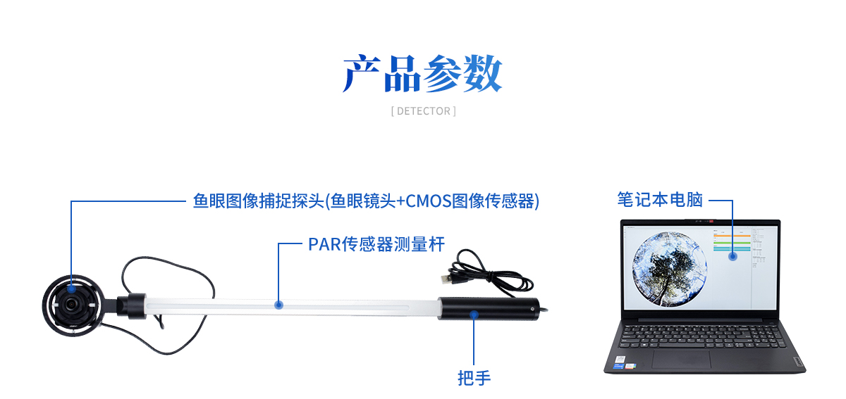植物冠層圖像分析儀由魚眼圖像捕捉探頭(由魚眼鏡頭及CCD圖像傳感器組成)、內(nèi)置25個PAR傳感器的測量桿(搖臂)、筆記本電腦、圖像采集軟件及圖像 分析軟件、高容量的可充電電池組組成。魚眼探頭安裝在一個很輕的搖臂的頂端,它可以獲取150°視角的魚眼圖像。圖像的顯示和存貯由配置的筆記本計算機(jī)完 成。