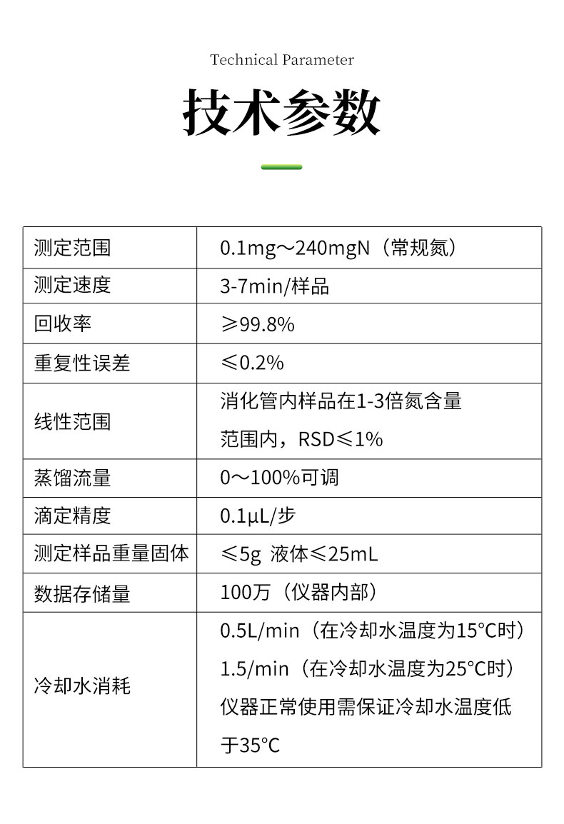 | 1.測定范圍:0.1mg~240mgN(常規(guī)氮) | 2.測定速度:3-7min/樣品 | 3.☆回收率:≥99.8% | 4.☆重復(fù)性誤差:≤0.2% | 5.線性范圍:消化管內(nèi)樣品在1-3倍氮含量范圍內(nèi),RSD≤1% | 6.蒸餾流量:0~100%可調(diào) | 7.☆滴定精度:0.1μL/步 | 8.測定樣品重量固體:≤6g 液體≤25mL | 9.☆數(shù)據(jù)存儲(chǔ)量:100萬(儀器內(nèi)部) | 10.☆500組用戶自定義方案 | 11.冷卻水消耗:0.5L/min(在冷卻水溫度為15℃時(shí)),1.5/min(在冷卻水溫度為25℃時(shí));儀器正常使用需保證冷卻水溫度低于35℃。 |