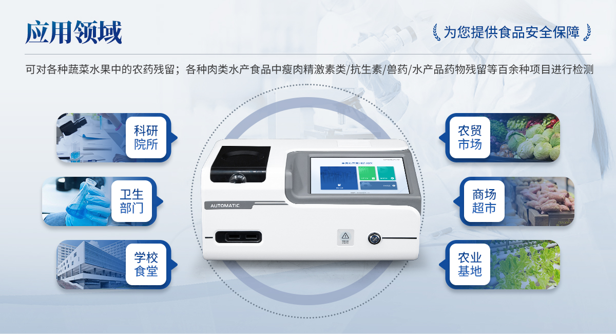 全自動農(nóng)獸藥殘留檢測儀可對各種蔬菜水果中有機磷和氨基甲酸酯類農(nóng)藥殘留;各種肉類水產(chǎn)食品中瘦肉精激素類殘留,抗生素殘留,獸藥殘留,水產(chǎn)品藥物殘留等百余種項目進行快速檢測。該設(shè)備廣泛應(yīng)用于蔬菜批發(fā)市場、超市、商場、食藥監(jiān)等部門的蔬菜和水果中的農(nóng)藥殘留檢測。