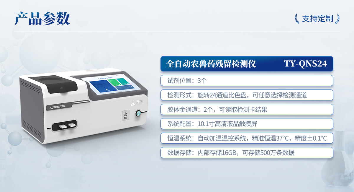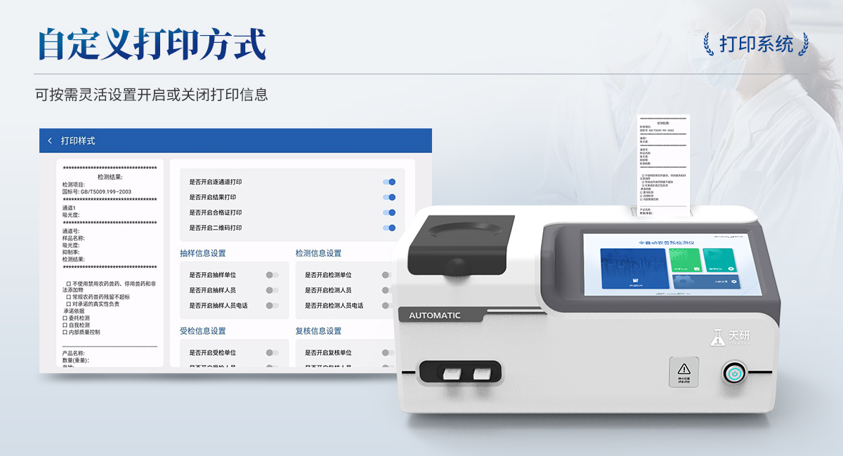 | 1. 試劑位置:3個 | 2. 農(nóng)殘檢測盤:旋轉(zhuǎn)24通道比色盤,可任意選擇檢測通道,自動對應(yīng)選擇通道。 | 3. 膠體金通道:2個,可讀取檢測卡結(jié)果,自動采集、處理分析,自動判斷檢測結(jié)果,并具備自動判空功能。 | 4.系統(tǒng)配置:10.1寸高清液晶觸摸屏,采用ARM Cortex?-A7,RK3288/4核處理器,運行內(nèi)存1GB。Android7.1.1 系統(tǒng)分辨率1280×800。 | 5.恒溫系統(tǒng):具有自動加溫溫控系統(tǒng),精準(zhǔn)恒溫37℃,精度±0.1℃。 | 6.添加系統(tǒng):儀器按照試劑要求自動、按時、按量加入試劑,并且自動對未正常放置的樣本或異常的樣本進行檢查并提示。 | 7.清洗功能:儀器具備回流及自動清洗管路功能,避免試劑污染。 | 8.混勻功能:設(shè)備具備自動混勻功能。 | 9.光源校準(zhǔn):設(shè)備可自動校準(zhǔn),確保檢測準(zhǔn)確度。 | 10.實時監(jiān)控:儀器測試過程中屏幕顯示運行狀態(tài),可實時查看。 | 11.數(shù)據(jù)存儲:內(nèi)部存儲16GB,可存儲500萬條數(shù)據(jù)。 | 12.樣品多選功能:設(shè)備具備樣品一鍵多選功能,選擇樣品自動匹配檢測通道。 | 13.項目預(yù)設(shè):可提前設(shè)置單個及多個相同或不相同的檢測任務(wù),可單次或者多次調(diào)取,減少檢測時間。 | 14.自定義打印系統(tǒng):內(nèi)置自定義打印系統(tǒng),可按需靈活設(shè)置開啟或關(guān)閉:產(chǎn)品合格證(國家農(nóng)業(yè)部標(biāo)準(zhǔn)),二維碼,抽樣信息、檢測信息,受檢信息等信息的打印。 | 15.A4版本報告打印功能:設(shè)備可自動生成A4版報告,A4報告帶二維碼,可掃描二維碼生成電子版,并可識別真?zhèn)巍?/td> | 16.傳輸方式:儀器配備無線通信模塊: 4G(APN)通訊模塊、Wifi模塊,藍牙傳輸模塊,同時具有USB接口以及RJ45接口能以多種方式實現(xiàn)數(shù)據(jù)保存和數(shù)據(jù)傳輸功能,設(shè)備數(shù)據(jù)可以同步上傳至平臺。 | 17.系統(tǒng)17.數(shù)據(jù)監(jiān)管系統(tǒng):設(shè)備自帶監(jiān)管平臺,并可同步對接監(jiān)管平臺,數(shù)據(jù)可局域網(wǎng)和互聯(lián)網(wǎng)數(shù)據(jù)上傳,檢測結(jié)果可直接傳至食品安全監(jiān)管平臺。達到食品安全問題預(yù)估、預(yù)警。 | 18.系統(tǒng)遠(yuǎn)程更新功能:無需設(shè)備返廠,即可遠(yuǎn)程實時升級全新系統(tǒng),節(jié)省時間成本及避免運輸造成設(shè)備損。 |