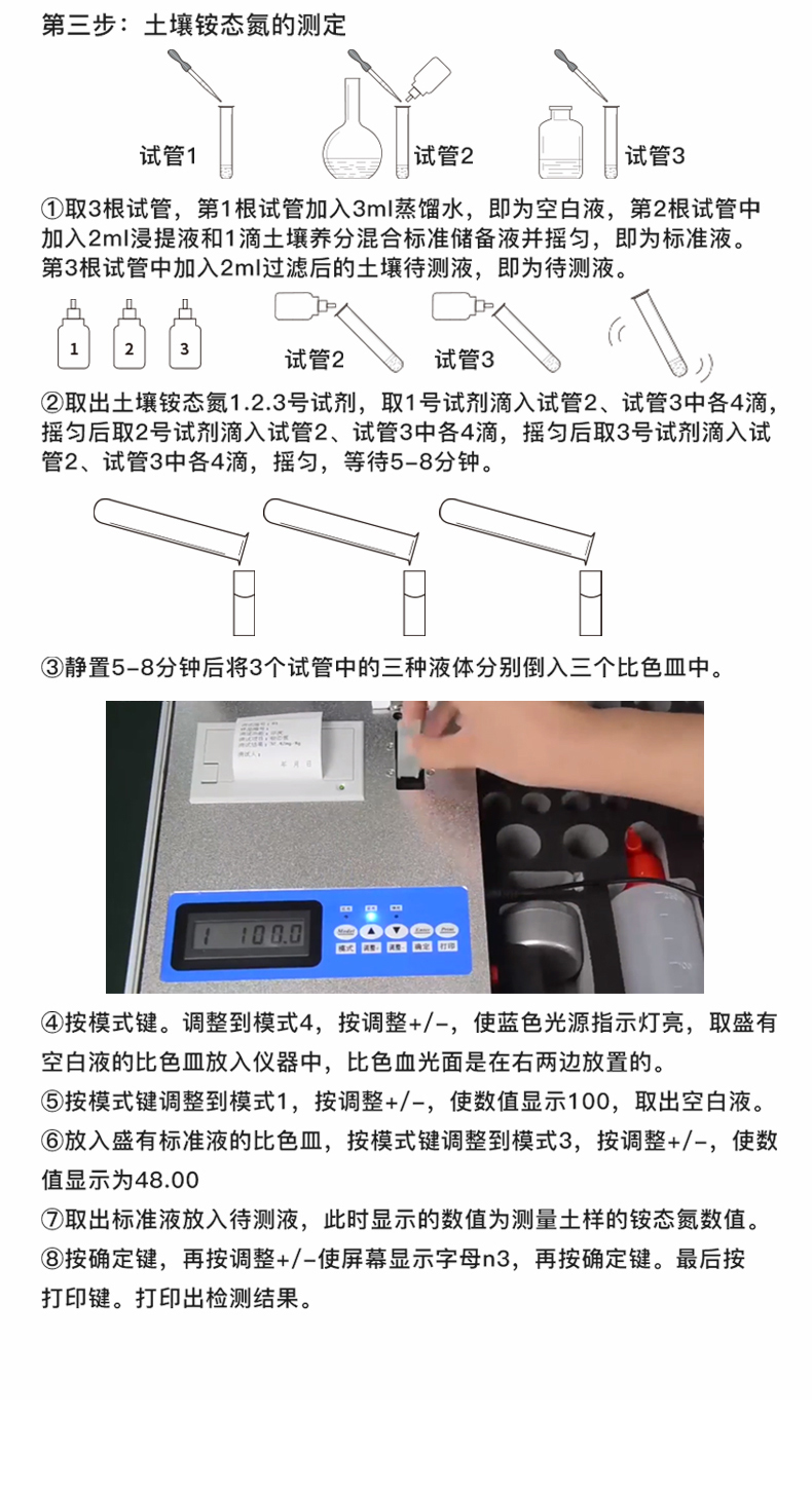 | 配套齊全:該儀器集藥、器、儀為一體,攜帶方便,相當(dāng)于一個(gè)小型實(shí)驗(yàn)室。適于農(nóng)業(yè)服務(wù)部門或農(nóng)資經(jīng)銷商、肥料廠商測(cè)土施肥和鑒別肥料真假。 | 操作簡(jiǎn)便、速度快捷,成品藥劑開瓶即用,無(wú)須配置。 | 性能可靠:工作穩(wěn)定性優(yōu)于國(guó)家標(biāo)準(zhǔn)JJG179-90指標(biāo)的6倍,重復(fù)性達(dá)到光柵型分光光度計(jì)指標(biāo)水平。 |