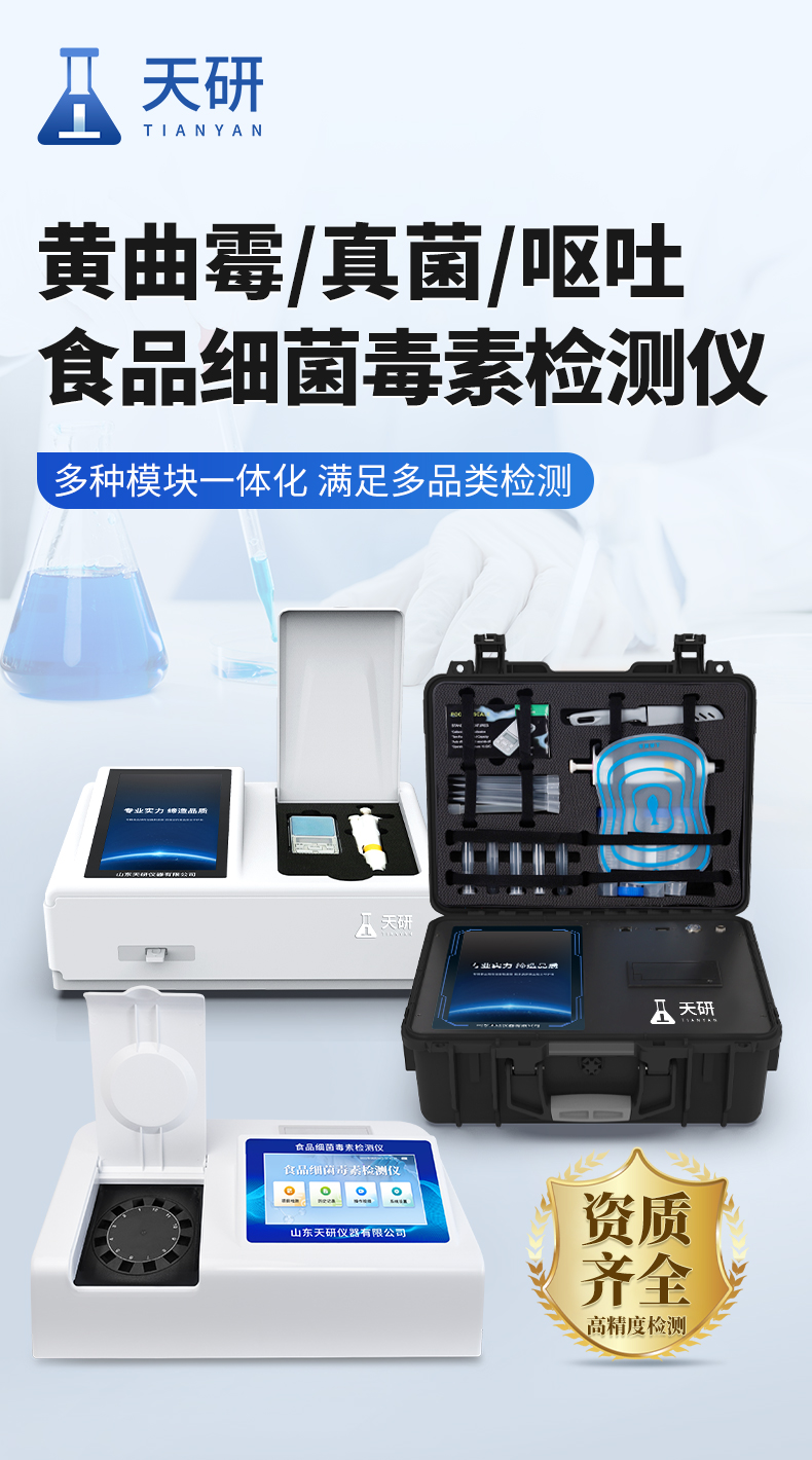 山東天研儀器有限公司生產(chǎn)的真菌毒素檢測(cè)儀應(yīng)用競爭抑制免疫層析的技術(shù)原理,通過就是通過待檢測(cè)物與抗體結(jié)合的方法,分析待檢樣品中真菌毒素殘留。可快速檢測(cè)糧食、飼料、谷物、食用油、調(diào)味品中如玉米、大米、小麥、大麥、糙米、麩皮、稻谷、豆粕、米糠、飼料中的黃曲霉毒素B1、M1、總量,玉米赤霉烯酮、嘔吐毒素、T2毒素、赭曲霉毒素、伏馬毒素等