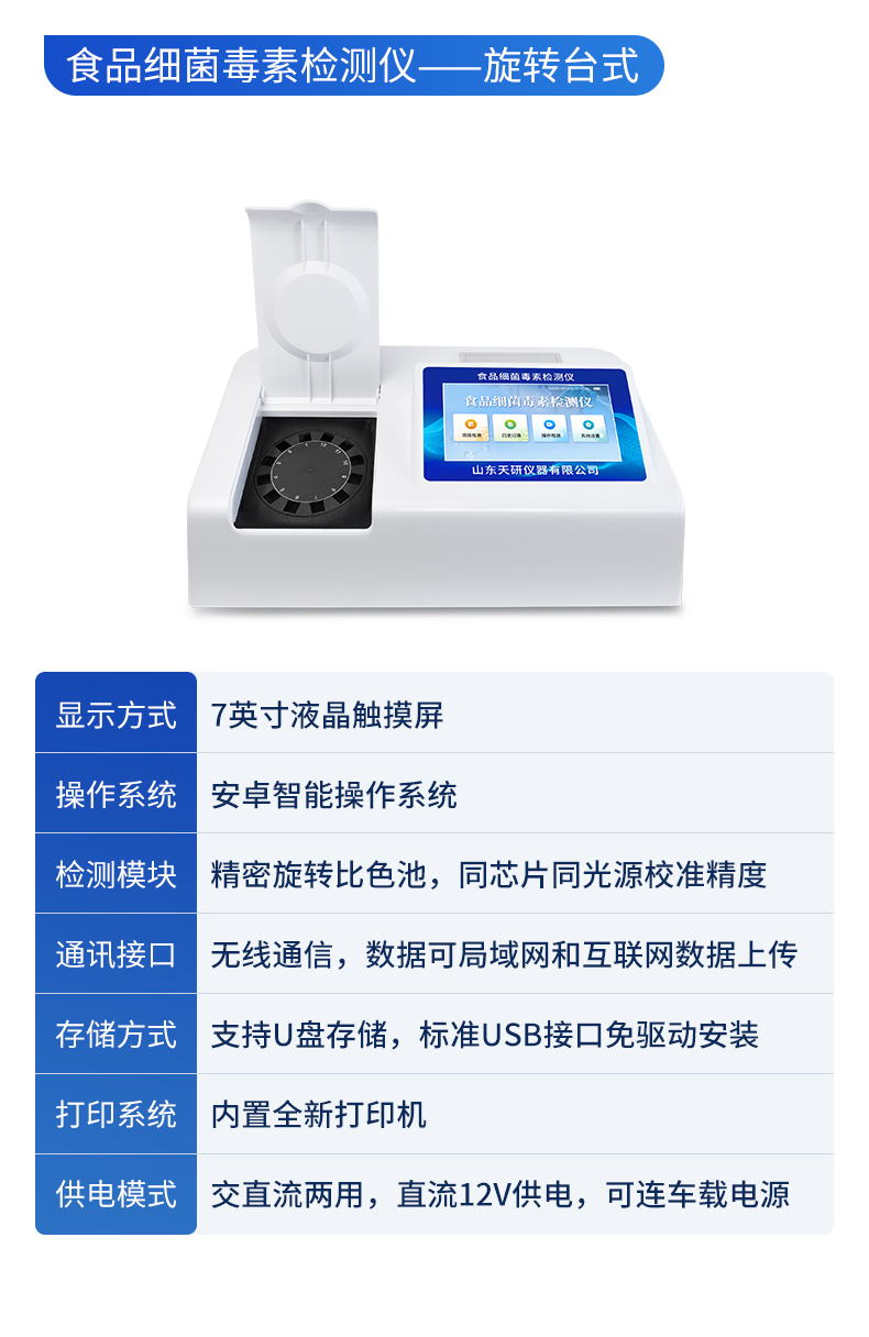 | 1、儀器采用10.1英寸液晶觸摸屏顯,搭配運(yùn)行安卓智能操作系統(tǒng),主控芯片采用ARM Cortex-A7,RK3288/4核處理器,主頻1.88Ghz,運(yùn)轉(zhuǎn)速度更快速,性能更強(qiáng)。 | 2、儀器功能包括:膠體金檢測(cè)模塊、數(shù)字化管理模塊、無線通訊模塊等,可以滿足同一軟件下實(shí)現(xiàn)所有檢測(cè)項(xiàng)目的檢測(cè),并在同一窗口展示檢測(cè)結(jié)果。 | 3.一體化臺(tái)式快檢設(shè)備,采用交直流兩用供電方式,可連接車載電源,配備6ah大容量充電鋰電池,可以滿足現(xiàn)場及流動(dòng)檢測(cè)使用的需求。儀器尺寸:43×35×20cm, 主機(jī)凈重:5.1kg | 4、系統(tǒng)自帶數(shù)據(jù)集成模塊,設(shè)備首頁自動(dòng)統(tǒng)計(jì)檢測(cè)數(shù)據(jù)包含:周檢測(cè)數(shù)據(jù)、月檢測(cè)數(shù)據(jù),全部檢測(cè)總數(shù)量,均包含檢測(cè)總數(shù),合格數(shù),不合格數(shù),以及相關(guān)柱形分析圖,對(duì)各項(xiàng)檢測(cè)數(shù)據(jù)清晰掌握,無需電腦查詢,更加快捷直觀。 | 5、儀器具有任務(wù)預(yù)設(shè)模塊,可在樣品送檢前提前預(yù)設(shè)樣品名稱、檢測(cè)指標(biāo)、送檢單位等信息,樣品送檢時(shí)一鍵調(diào)取保存信息,檢測(cè)更加方便快捷。 | 6、膠體金檢測(cè)模塊: | 直插式自動(dòng)掃描方式,可實(shí)時(shí)顯示金標(biāo)卡實(shí)時(shí)圖像,系統(tǒng)自動(dòng)分析并呈現(xiàn)出CT曲線圖,CT線自動(dòng)識(shí)別,無需手動(dòng)調(diào)整,完成檢測(cè)后自動(dòng)退出檢測(cè)卡。 | 結(jié)果判定線可修改,對(duì)照值標(biāo)定值可保存,斷電不丟失數(shù)據(jù)。 | 兼容市場上其他膠體金卡,使用耗材不受限制,極大增強(qiáng)用戶使用體驗(yàn)。 | 7、儀器檢測(cè)系統(tǒng)擁有龐大數(shù)據(jù)庫,并且構(gòu)建了完善的檢索、修訂功能。食品庫涵蓋多種樣品名稱,可按需添加或刪除、編輯樣品名稱;產(chǎn)品數(shù)據(jù)庫以及歷史檢測(cè)記錄支持一鍵檢索功能。 | 8、系統(tǒng)打印自定義化,打印格式多樣化,產(chǎn)品合格證(國家標(biāo)準(zhǔn)要求),二維碼,抽樣信息、檢測(cè)信息,受檢信息、復(fù)核信息、抽樣日期、檢測(cè)日期等信息結(jié)果,可按需求自行設(shè)置打印內(nèi)容。 | 9、A4紙版本報(bào)告打印功能(可選配):設(shè)備擁有兩種結(jié)果展示方式,可以自動(dòng)生成A4打印模板和小票打印模板兩種樣式,可通過WiFi及網(wǎng)線等方式鏈接外置打印機(jī)可進(jìn)行打印 | 10、儀器具有 wifi 聯(lián)網(wǎng)上傳、RJ45網(wǎng)線連接功能,可以快速上傳數(shù)據(jù)。同步對(duì)接監(jiān)管平臺(tái),數(shù)據(jù)可局域網(wǎng)和互聯(lián)網(wǎng)數(shù)據(jù)上傳,檢測(cè)結(jié)果直接傳至食品安全監(jiān)管平臺(tái)。進(jìn)行區(qū)域食品安全監(jiān)管及大數(shù)據(jù)分析處理與數(shù)據(jù)統(tǒng)計(jì),檢測(cè)區(qū)域食品安全長短期動(dòng)態(tài),達(dá)到食品安全問題預(yù)估、預(yù)警。 | 11、設(shè)備支持U盤存儲(chǔ),標(biāo)準(zhǔn)USB接口,免驅(qū)動(dòng)安裝。檢測(cè)結(jié)果存儲(chǔ)容量20萬條以上,可生成Excel表格,進(jìn)行一鍵拷貝,并具有登錄保護(hù)功能,可設(shè)置用戶名及密碼,規(guī)范不同人員操作權(quán)限,防止非工作人員操作,并且可以進(jìn)行重新校準(zhǔn)、鎖定、恢復(fù)出廠設(shè)置功能。儀器固件可升級(jí),后期檢測(cè)項(xiàng)目可擴(kuò)充。 | 12、儀器具備遠(yuǎn)程升級(jí)功能,可定向分客戶分儀器更新,開機(jī)后自動(dòng)更新,并可持續(xù)性免費(fèi)更新系統(tǒng)版本,無需像傳統(tǒng)產(chǎn)品返廠更新,節(jié)省時(shí)間及人力成本并避免了物流運(yùn)輸返廠升級(jí)導(dǎo)致設(shè)備損壞的潛在風(fēng)險(xiǎn)。 |
