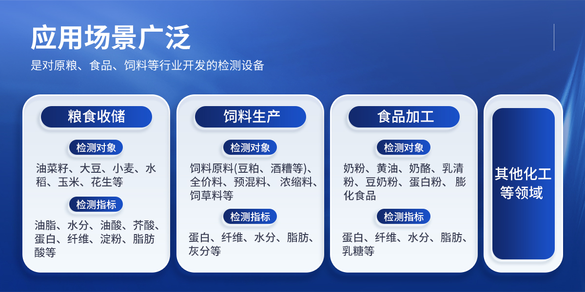 檢測對象:飼料原料(豆粕、酒糟等)、全價料、預(yù)混料、濃縮料、飼草料等 檢測指標(biāo):蛋白、纖維、水分、脂肪、灰分等; | ◆ 食品加工: