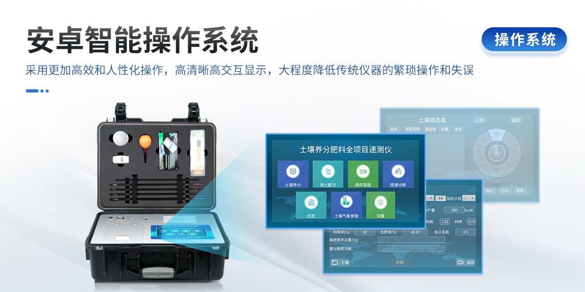 | 安卓智能操作系統(tǒng)Android 7.1版本,主控芯片采用ARM Cortex-A7,RK3288/4核處理器,主頻1.88Ghz,運(yùn)轉(zhuǎn)速度更快速,穩(wěn)定性更強(qiáng)。 | 可檢測(cè)各種土壤、肥料、作物、食品、水質(zhì)、環(huán)境等共200多個(gè)測(cè)試項(xiàng)目,一機(jī)多用,功能齊全。 | 測(cè)試速度更快!無(wú)需空白對(duì)照和標(biāo)準(zhǔn)校準(zhǔn),省卻以往繁瑣的操作步驟,一鍵式操作,直接讀取數(shù)據(jù),**率,低消耗。 | 12個(gè)旋轉(zhuǎn)檢測(cè)通道,一次性可快速檢測(cè)12個(gè)樣品,極大提升檢測(cè)效率,降低檢測(cè)成本。 | 采用高精度濾光片技術(shù)自主專利分析方法(專利號(hào):ZL 2020 2 1763837.9),**認(rèn)證。 | 具有自身保護(hù)功能,內(nèi)置人臉識(shí)別攝像頭可掃臉登錄,也可設(shè)置用戶名和密碼,防止非工作人員操作查看實(shí)驗(yàn)數(shù)據(jù)。 | 檢測(cè)過(guò)程中內(nèi)置校準(zhǔn)功能,智能恒流穩(wěn)壓,光強(qiáng)自動(dòng)校準(zhǔn),確保檢測(cè)準(zhǔn)確度,取得中國(guó)計(jì)量科學(xué)研究院的《校準(zhǔn)證書(shū)》 | 內(nèi)置傳感器航空接口,插拔方便,配備FDR傳感器、環(huán)境多要素傳感器。 | FDR傳感器為土壤三參數(shù)一體式,可同時(shí)測(cè)量土壤水分含量、土壤環(huán)境溫度、土壤電導(dǎo)率(鹽分)方便快捷。 | 環(huán)境多要素傳感器為6要素一體式,可同時(shí)測(cè)量空氣溫度、空氣濕度、露點(diǎn)、大氣壓力、光照度、二氧化碳。 | 儀器標(biāo)配wifi無(wú)線上傳、4G聯(lián)網(wǎng)傳輸、GPRS無(wú)線遠(yuǎn)傳,快速上傳數(shù)據(jù)。 | 配有智慧云農(nóng)業(yè)平臺(tái),儀器連入無(wú)線網(wǎng)絡(luò)后,可將檢測(cè)數(shù)據(jù)可選擇性或批量無(wú)線上傳,方便用戶進(jìn)行數(shù)據(jù)管理和長(zhǎng)期分析。 | 儀器配同時(shí)具有USB接口、以太網(wǎng)接口,內(nèi)置大容量?jī)?nèi)存,并可隨時(shí)用U盤拷貝數(shù)據(jù)。 | 可用手機(jī)隨時(shí)登錄云平臺(tái)在線移動(dòng)查看歷史數(shù)據(jù) | 內(nèi)置作物專家施肥系統(tǒng),可對(duì)百余種全國(guó)農(nóng)業(yè)經(jīng)濟(jì)作物、果樹(shù)等的目標(biāo)產(chǎn)量計(jì)算推薦施肥量,依據(jù)施肥配方科學(xué)指導(dǎo)農(nóng)業(yè)生產(chǎn)。測(cè)土配方施肥結(jié)果可打印,打印內(nèi)容包含:作物種類、肥料種類、目標(biāo)產(chǎn)量、需求總量、建議施肥方案。 | 內(nèi)置植物營(yíng)養(yǎng)診斷標(biāo)準(zhǔn)圖譜,根據(jù)各農(nóng)作物營(yíng)養(yǎng)缺失的圖片,進(jìn)行葉面對(duì)比,診斷豐缺。 | 4波長(zhǎng)專業(yè)測(cè)試?yán)涔庠矗t、藍(lán)、綠、橙),光源波長(zhǎng)穩(wěn)定,長(zhǎng)時(shí)間連續(xù)工作光源無(wú)溫漂現(xiàn)象,壽命長(zhǎng)達(dá)10萬(wàn)小時(shí)級(jí)別,重現(xiàn)性好,準(zhǔn)確度高。 | 比色池部分采用標(biāo)準(zhǔn)1cm比色皿,無(wú)機(jī)械位移及磨損,光路測(cè)試定位**,有效屏蔽外光干擾,保證檢測(cè)結(jié)果優(yōu)于國(guó)標(biāo)要求。 | 儀器系統(tǒng)內(nèi)帶有樣品前處理操作視頻,各種樣品檢測(cè)方法點(diǎn)擊視頻模塊即可觀看,檢測(cè)人員無(wú)需自學(xué)說(shuō)明書(shū),指導(dǎo)教學(xué)方便快速,方便新手快速操作。 | 內(nèi)置新一代高速熱敏打印機(jī)(無(wú)需色帶),打印內(nèi)容包含:檢測(cè)單位、檢測(cè)人員、檢測(cè)項(xiàng)目、通道號(hào)、吸光度、養(yǎng)分含量(mg/kg)、檢測(cè)時(shí)間、以及二維碼等信息 | 高靈敏7寸真彩觸摸屏,采用更加**和人性化操作,高清晰高交互顯示,大程度降低傳統(tǒng)儀器的繁瑣操作和失誤,并取得多項(xiàng)《軟件著作權(quán)》。 | 內(nèi)置時(shí)鐘功能,方便操作時(shí)間記錄,長(zhǎng)期歷史追溯。 | 可設(shè)置多賬戶賬號(hào)密碼登錄,**UI交互界面,不同的用戶可自由添加編輯檢測(cè)信息,保存后可長(zhǎng)期使用。 | GPS功能:可在野外作業(yè)時(shí)記錄經(jīng)緯度地點(diǎn),滿足特殊用戶需求。 | 內(nèi)置低電壓提示功能,可在檢測(cè)時(shí)明確電量,避免測(cè)試數(shù)據(jù)偏移,同時(shí)具有斷電保護(hù)功能,斷電自動(dòng)保存數(shù)據(jù),防止數(shù)據(jù)丟失。 | 交直流兩用供電方式,內(nèi)置大容量充電鋰電池,滿電狀態(tài)下可連續(xù)工作10余小時(shí),同時(shí)可外接車載電源蓄電 | 儀器具有中英文切換功能,可滿足出口要求。 | 高強(qiáng)度PVC工程塑料手提箱設(shè)計(jì),堅(jiān)固耐用,便于攜帶。 |