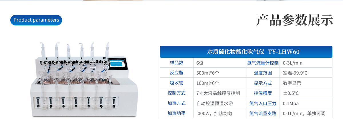 水樣中的硫化物經(jīng)酸化,生成的硫化氫隨載氣(氮?dú)猓┻M(jìn)入吸收瓶/吸收顯色管中被吸收溶液(乙酸鋅-乙酸鈉溶液或2%氫氧化鈉溶液)吸收,選擇相應(yīng)的分析方法對(duì)吸收瓶/吸收顯色管中吸收的硫離子進(jìn)行分析測(cè)定。水質(zhì)硫化物酸化吹氣儀根據(jù)2022年新國(guó)標(biāo)水質(zhì)硫化物的測(cè)定-亞甲基藍(lán)分光光度法(典量法)標(biāo)準(zhǔn)開(kāi)發(fā)生產(chǎn)的。水質(zhì)硫化物測(cè)定的樣品前處理需要。
