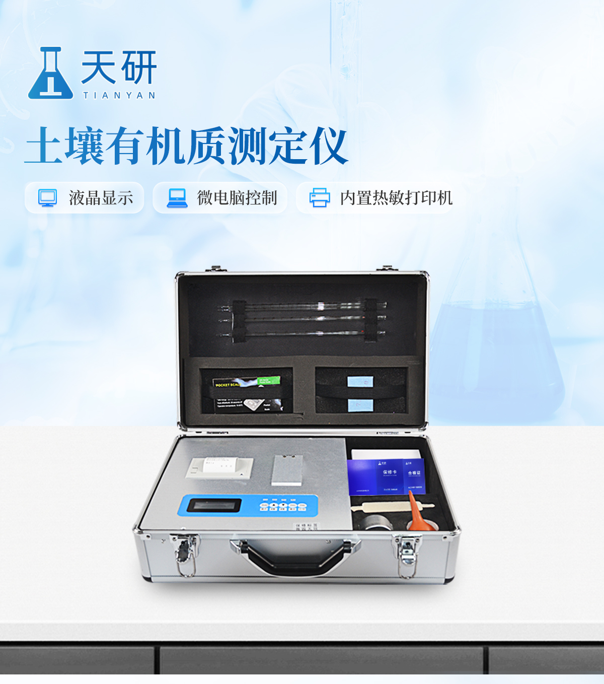 | 全國獨(dú)家《機(jī)箱/藥劑一體式鋁合金機(jī)箱》專利設(shè)計(jì),便于攜帶、堅(jiān)固耐用,配套成品藥劑 | 微電腦控制,數(shù)字化線路、程序化設(shè)計(jì),液晶顯示,交直流兩用,可野外流動(dòng)測試,最大程度降低操作者的失誤和勞動(dòng)強(qiáng)度。 | 分辨率:0.001,觸摸式按鍵,內(nèi)置高檔熱敏打印機(jī),可打印測試結(jié)果。 | 可檢測土壤及化肥、有機(jī)肥、植株中的有機(jī)質(zhì)含量,土壤酸堿度,含鹽量(擴(kuò)展)。 | 土壤養(yǎng)分速測儀采用高亮度 LED 燈作為光源, 硅半導(dǎo)體作為信號接收系統(tǒng), 壽命長達(dá)10萬小時(shí)級別。光源穩(wěn)定,一致性好。 | 比色槽部分采用單通道、雙光路設(shè)計(jì),無機(jī)械位移及磨損,光路測試定位**,保證測定結(jié)果精度。 |