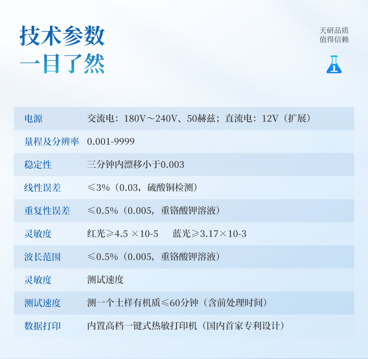 | 電源:交流電:180V~240V、50赫茲;直流電:12V(擴(kuò)展) | 量程及分辨率:0.001-9999 | 穩(wěn)定性:三分鐘內(nèi)漂移小于0.003 | 線性誤差:≤3%(0.03,硫酸銅檢測) | 重復(fù)性誤差:≤0.5%(0.005,重鉻酸鉀溶液) | 靈敏度:紅光≥4.5 ×10-5 藍(lán)光≥3.17×10-3 | 波長范圍:紅光620±8nm 藍(lán)光440±8nm | 測試速度:測一個(gè)土樣有機(jī)質(zhì)≤60分鐘(含前處理時(shí)間) | 可同時(shí)檢測8個(gè)土樣≤個(gè)小時(shí)(含前處理時(shí)間) | 數(shù)據(jù)打印:內(nèi)置高檔一鍵式熱敏打印機(jī)(國內(nèi)首家專利設(shè)計(jì)) |