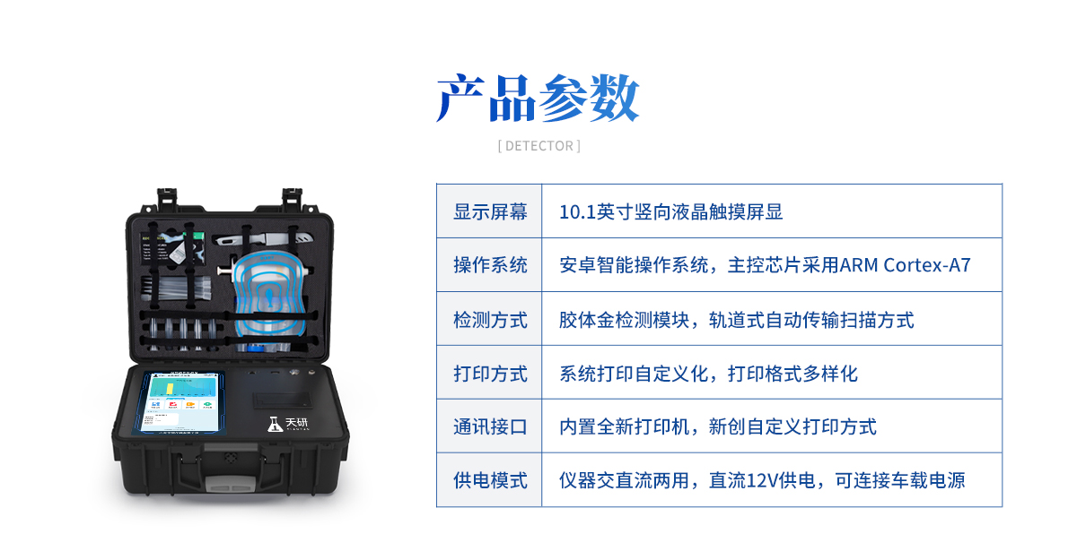 | 核心功能模塊:膠體金檢測(cè)模塊、數(shù)字化管理模塊、無(wú)線通訊模塊 | 供電方式:交直流兩用,可連接車(chē)載電源 |