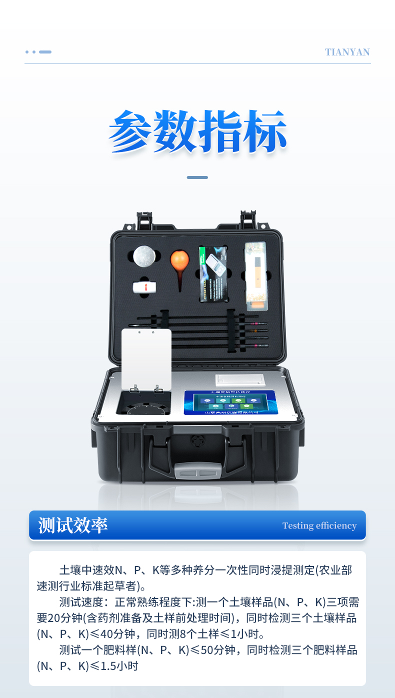土壤氮磷鉀檢測儀器集藥、器、儀為一體,攜帶方便,相當于一個小型移動實驗室,無需用戶自配附件,亦可靈活野外流動測試。適于農(nóng)業(yè)服務部門或農(nóng)資經(jīng)銷商、合作社、肥料廠商、大種植戶測土施肥和鑒別肥料真假。 檢測功能全:測試項目國內(nèi)外全面,除標配試劑外,其他各類藥劑均可加配選購。
