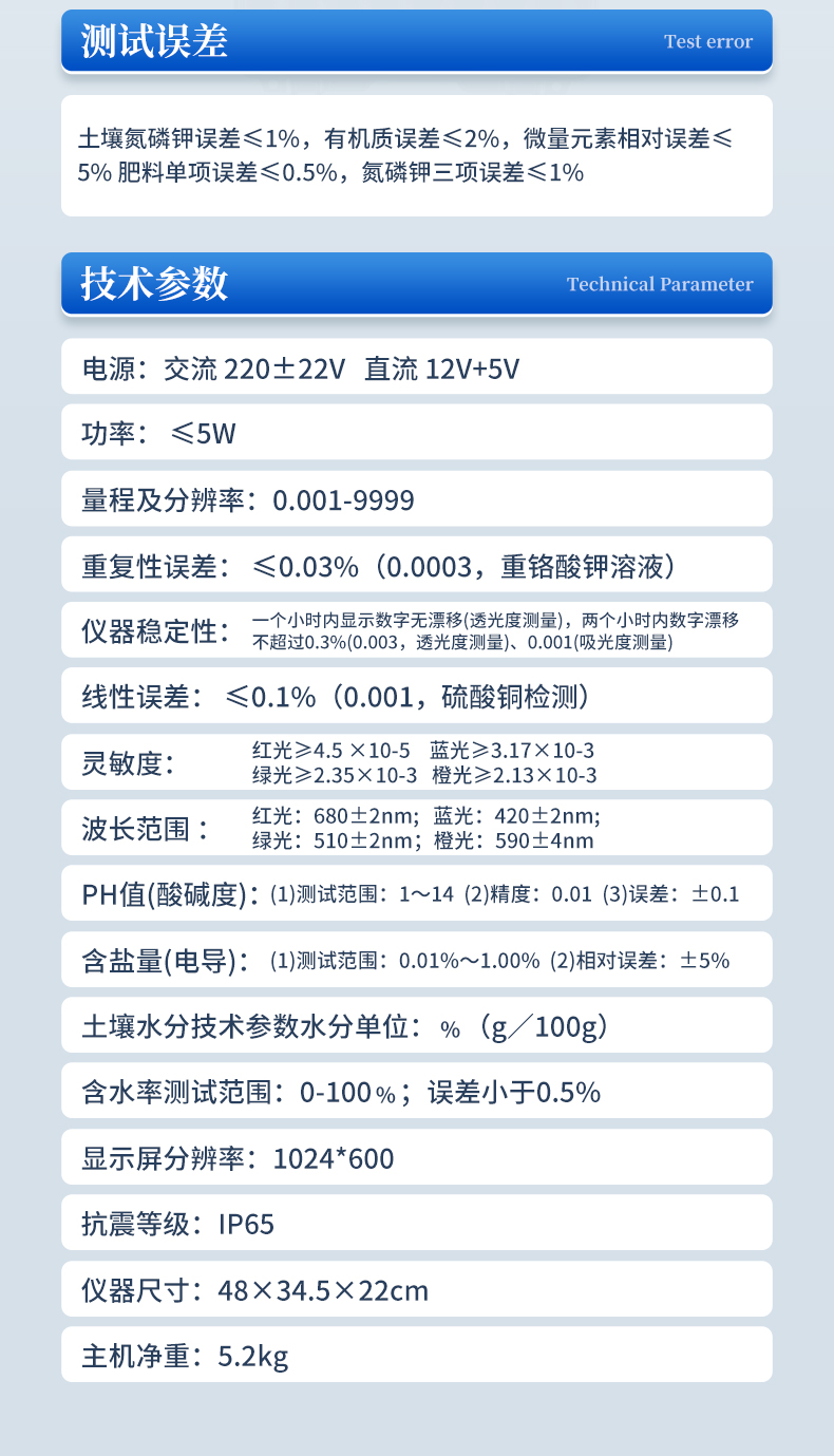 | 1、電源:交流 220±22V 直流 12V+5V(儀器內(nèi)置鋰電池也可用車載電源) | 2、功率: ≤5W | 3、量程及分辨率:0.001-9999 | 4、重復性誤差: ≤0.02%(0.0002,重鉻酸鉀溶液) | 5、儀器穩(wěn)定性:一個小時內(nèi)顯示數(shù)字無漂移(透光度測量);兩個小時內(nèi)數(shù)字漂移不超過0.3%(0.003,透光度測量)、0.001(吸光度測量)。 | 6、線性誤差: ≤0.1%(0.001,硫酸銅檢測) | 7、靈敏度:紅光≥4.5 ×10-5 藍光≥3.17×10-3 綠光≥2.35×10-3 橙光≥2.13×10-3 | 8、波長范圍 :紅光:680±2nm; 藍光:420±2nm; 綠光:510±2nm;橙光:590±4nm | 9、PH值(酸堿度): (1)測試范圍:1~14 (2)精度:0.01 (3)誤差:±0.1 | 10、含鹽量(電導):(1)測試范圍:0.01%~1.00% (2)相對誤差:±5% | 11、土壤水分技術參數(shù)水分單位:﹪(g/100g);含水率測試范圍:0-100﹪;誤差小于0.5% | 12、顯示屏分辨率:1024*600 | 13、抗震等級:IP65 | 14、儀器尺寸:48×34.5×22cm。 | 15、主機凈重:5.2kg | 16、包裝尺寸:510*390*375mm | 17、包裝重量:11.5kg |
