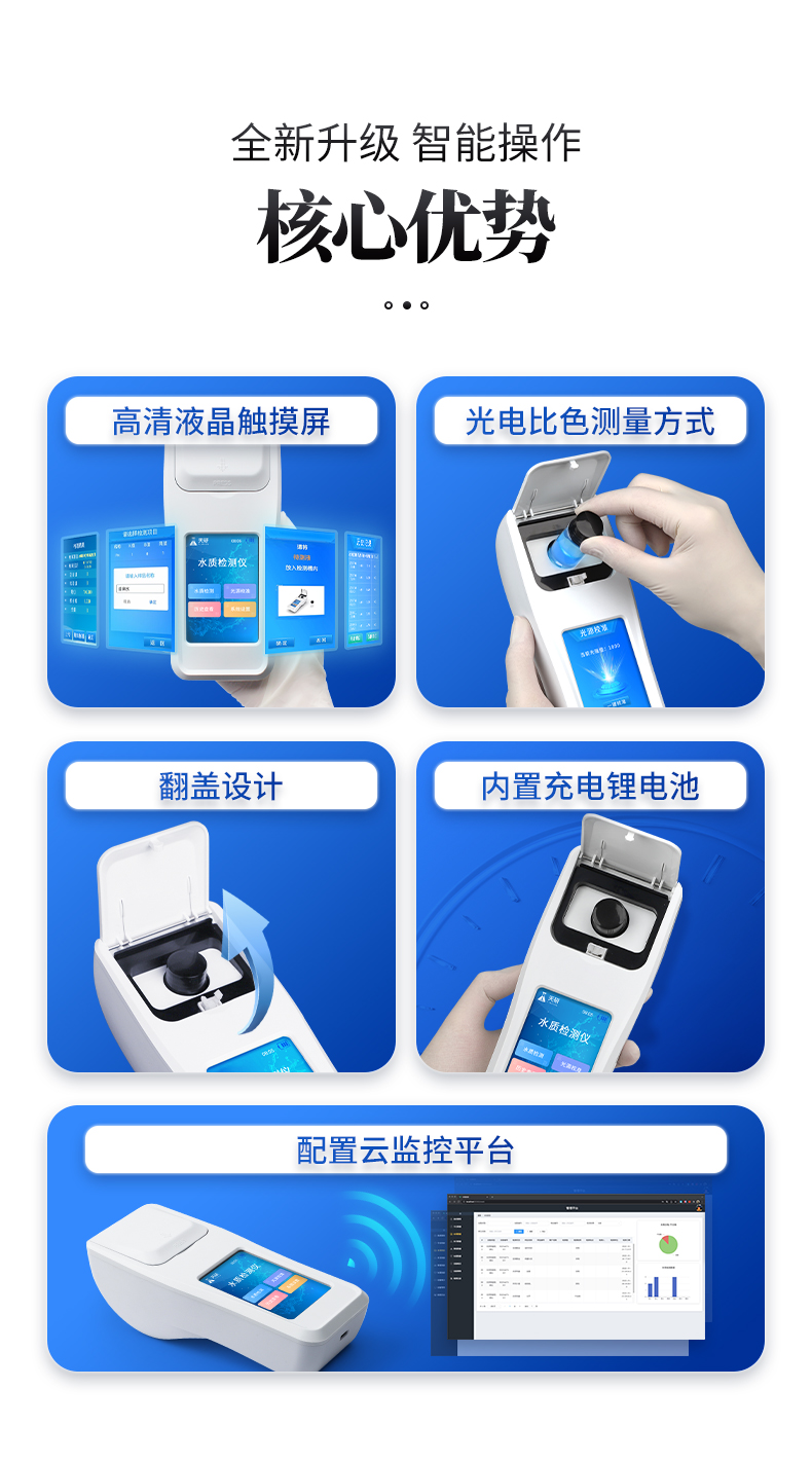 | 1、安卓智能系統(tǒng),操作更佳簡便快捷; | 2、配置云監(jiān)控平臺,檢測結果可直接無線傳至平臺,進行水質(zhì)長短期分析,輔助管理; | 3、內(nèi)置操作流程、操作簡單、無需培訓、直接上手; | 4、檢測速度更快,現(xiàn)場讀取數(shù)據(jù); | 5、便攜式體積小,重量輕,方便戶外檢測; | 6、外形小巧美觀,工作穩(wěn)定免維護,具有較好的性價比; | 7、采用進口冷光源,光學性能穩(wěn)定,壽命長達10萬小時; | 8、交直流兩用,內(nèi)置充電鋰電池,環(huán)保耐用可支持連續(xù)室內(nèi)外工作。 |