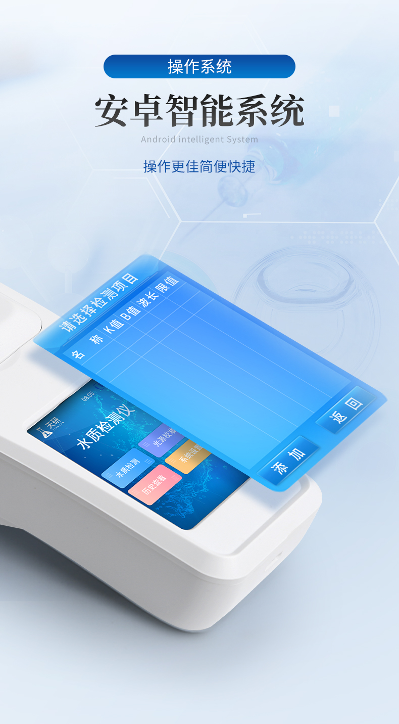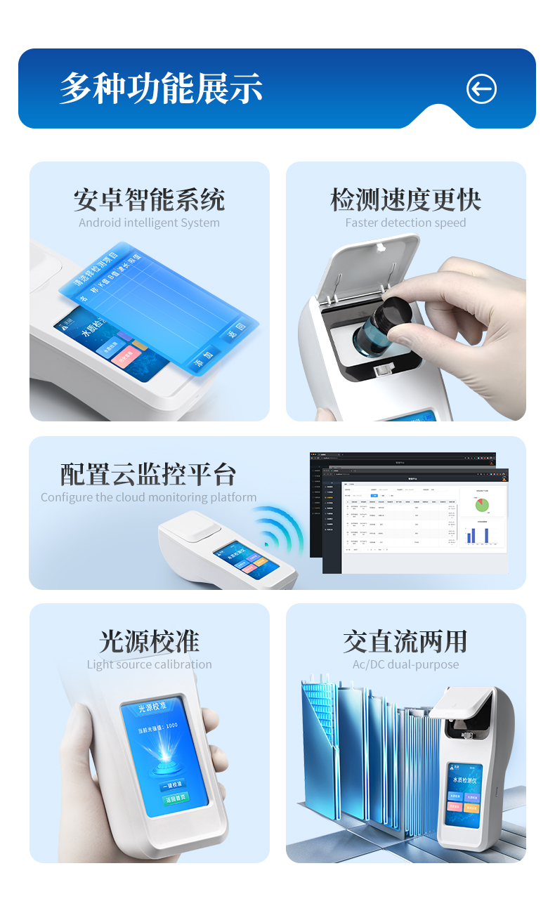 | 1、安卓智能系統(tǒng),操作更佳簡便快捷; | 2、配置云監(jiān)控平臺,檢測結(jié)果可直接無線傳至平臺,進行水質(zhì)長短期分析,輔助管理; | 3、內(nèi)置操作流程、操作簡單、無需培訓(xùn)、直接上手; | 4、檢測速度更快,現(xiàn)場讀取數(shù)據(jù); | 5、便攜式體積小,重量輕,方便戶外檢測; | 6、外形小巧美觀,工作穩(wěn)定免維護,具有較好的性價比; | 7、采用進口冷光源,光學(xué)性能穩(wěn)定,壽命長達10萬小時; | 8、交直流兩用,內(nèi)置充電鋰電池,環(huán)保耐用可支持連續(xù)室內(nèi)外工作。 |