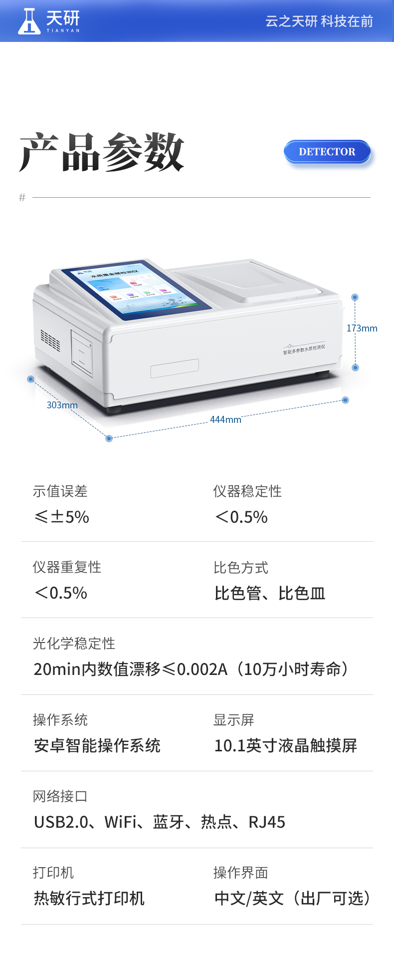 | 1、操作系統(tǒng):Android 7.1.1 智能操作系統(tǒng); | 2、顯示屏:10.1英寸高清晰度彩色液晶觸摸屏; | 3、網(wǎng)絡(luò)接口:USB2.0、WiFi、藍(lán)牙、熱點(diǎn)、RJ45; | 4、操作界面:中文/英文(出廠可選); | 5、比色方式:比色管、比色皿; | 6、打印機(jī):熱敏行式打印機(jī); | 7、通訊接口:USB2.0; | 8、供電方式:交流220V,可選配大容量充電鋰電池; | 9、數(shù)據(jù)導(dǎo)出格式:Excel表格; | 10、云平臺:儀器帶有監(jiān)管平臺,連接網(wǎng)絡(luò),檢測結(jié)果直接傳至環(huán)境安全監(jiān)管平臺; | 11、儀器尺寸:444 x 303 x 173 mm; | 12、儀器重量:5.2kg(不含適配器或充電器及電池); |