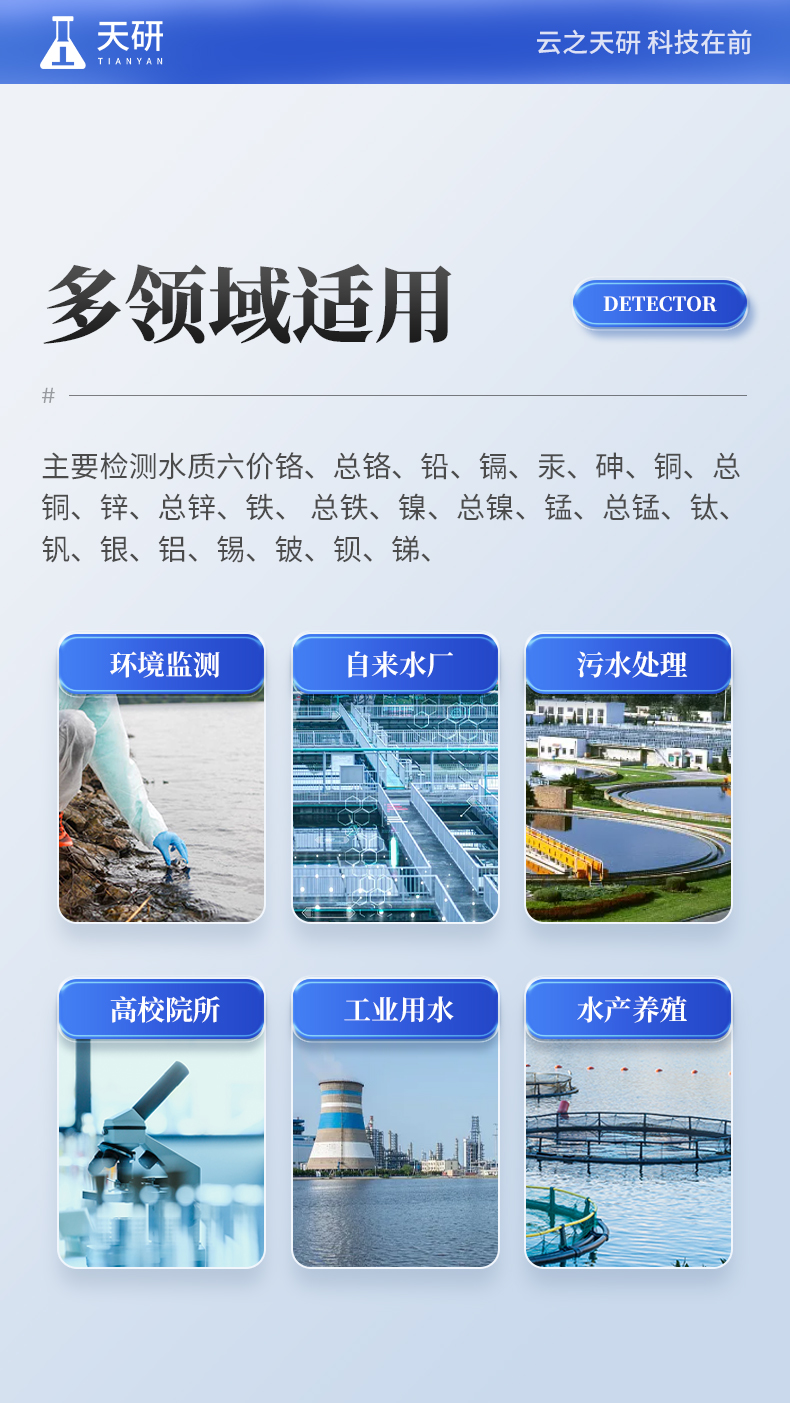 多參數(shù)水質(zhì)重金屬檢測儀是完全參考國家標(biāo)準(zhǔn)、環(huán)境標(biāo)準(zhǔn)等相關(guān)標(biāo)準(zhǔn)設(shè)計(jì)制造,適用于國內(nèi)外眾多檢測標(biāo)準(zhǔn)。 主要檢測水質(zhì)六價(jià)鉻、總鉻、鉛、鎘、汞、砷、銅、總銅、鋅、總鋅、鐵、總鐵、鎳、總鎳、錳、總錳、鈦、釩、銀、鋁、錫、鈹、鋇、銻、鈷等重金屬含量指標(biāo);本儀器兼具智能數(shù)據(jù)分析功能,圖表、列表顯示數(shù)據(jù),分析一目了然;高清晰度彩色液晶觸摸顯示屏,Android智能操作系統(tǒng),中文顯示界面,中英文鍵盤,人性化操作,使用更簡單。