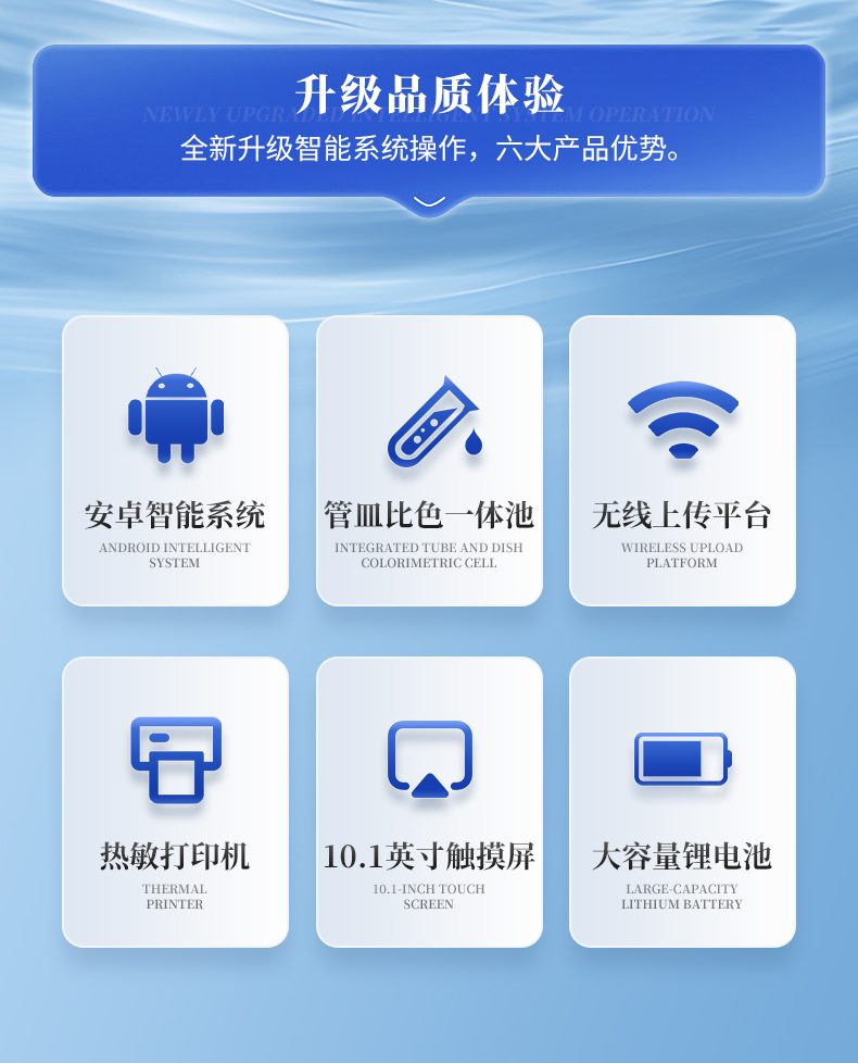 | 1、采用全新安卓7.1.1智能操作系統(tǒng),人性化中文操作界面,運(yùn)轉(zhuǎn)速度更快速,穩(wěn)定性更強(qiáng)。 | 2、10.1英寸液晶觸摸屏顯示,人性化中文操作界面,讀數(shù)直觀、簡單。 | 3、采用精密比色池設(shè)計(jì),使用光源一致,可以解決由于光源誤差帶來的檢測結(jié)果誤差問題,檢測結(jié)果更加精準(zhǔn)。 | 4、光源采用進(jìn)口超高亮發(fā)光二極管,光源亮度可以自動(dòng)調(diào)節(jié)與校準(zhǔn)。 | 5、支持10mm、30mm、50mm皿比色和φ16mm管比色等比色方式,多元選擇,確保測量的準(zhǔn)確性; | 6、具有無線通訊功能,支持WIFI、RJ45、手機(jī)熱點(diǎn)聯(lián)網(wǎng)傳輸,檢測數(shù)據(jù)亦可通過U盤導(dǎo)出; | 7、多功能樣品管理,可對樣品進(jìn)行中英文命名,方便樣品記錄和數(shù)據(jù)存儲; | 8、儀器可永久存儲800萬組數(shù)據(jù),為方便大量數(shù)據(jù)查找,可通過時(shí)間檢索,并隨意選擇分析; | 9、儀器帶有監(jiān)管云平臺,數(shù)據(jù)可通過局域網(wǎng)和互聯(lián)網(wǎng)上傳,亦可對接上傳至環(huán)境監(jiān)管部門平臺。 | 10、內(nèi)置熱敏行式打印機(jī),打印紙上的內(nèi)容可自由選擇(包括二維碼打?。?; | 11、交流220V,可選配6ah大容量充電鋰電池,方便戶外流動(dòng)測試; | 12、后期產(chǎn)品固件可升級。 |