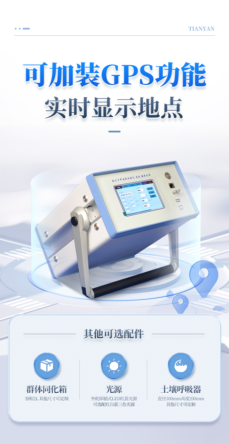 葉室: (可任選一款) I型:(20×20mm) II型:(55×20mm) III型:(55×10mm) IV型:直徑11.3mm的圓 GPS定位:可附帶GPS定位功能,可實(shí)時(shí)顯示測(cè)量地點(diǎn)的經(jīng)緯度 群體同化箱:體積:2升。其他尺寸可定制 土壤呼吸器:直徑100mm,高度200mm。其他尺寸可定制 光源:外配即插式LED紅藍(lán)光源,可調(diào)范圍0—3000μmol·m?2·s?1。光強(qiáng)值可通過(guò)儀器設(shè)定??蛇x配紅白藍(lán)三色光源,紅光660nm,藍(lán)光455nm以及高光效白光