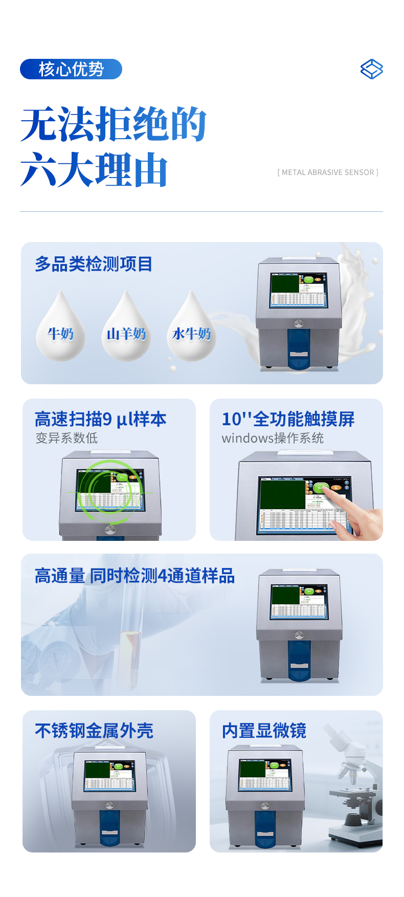 | 1、適用牛奶、羊奶、水牛奶等多種奶樣; 2、高速掃描9 μl樣本,變異系數(shù)低,結(jié)果精準(zhǔn)可靠; 3、高通量,同時(shí)檢測(cè)4通道樣品; 4、內(nèi)置顯微鏡,快速自動(dòng)對(duì)焦及細(xì)胞計(jì)數(shù)軟件,20-60秒即得結(jié)果; 5、嵌入圖像分析軟件,圖像顯示檢測(cè)結(jié)果,更直觀; | 6、無需校準(zhǔn),易維護(hù); 7、采用不銹鋼金屬外殼,設(shè)計(jì)緊湊便攜,節(jié)省空間; 8、采用10''全功能觸摸屏,windows操作系統(tǒng); 9、大容量內(nèi)存,且內(nèi)置打印機(jī),易于保存數(shù)據(jù); 10、提供軟件自動(dòng)更新和遠(yuǎn)程服務(wù); |
