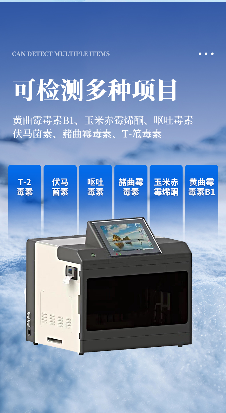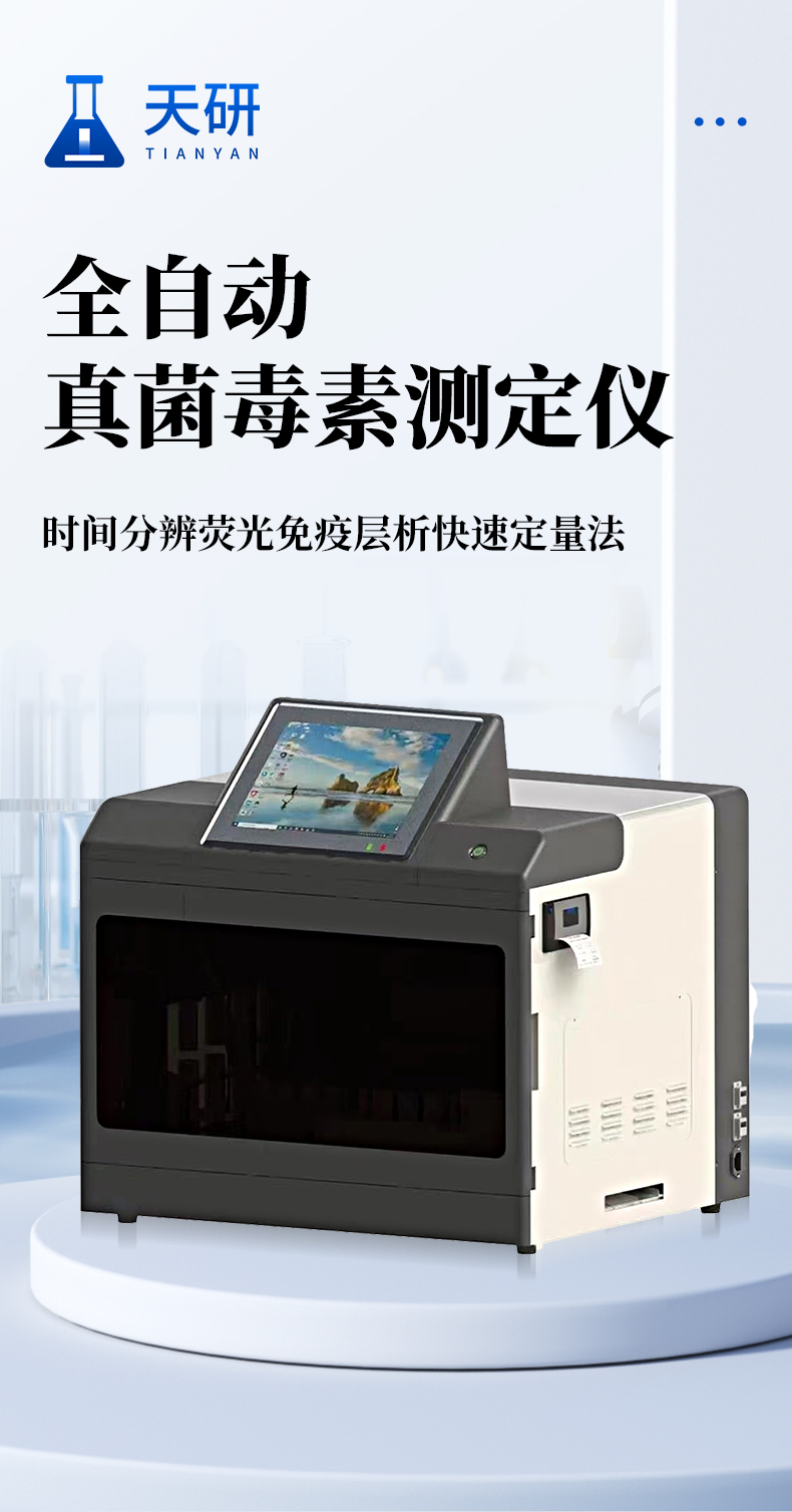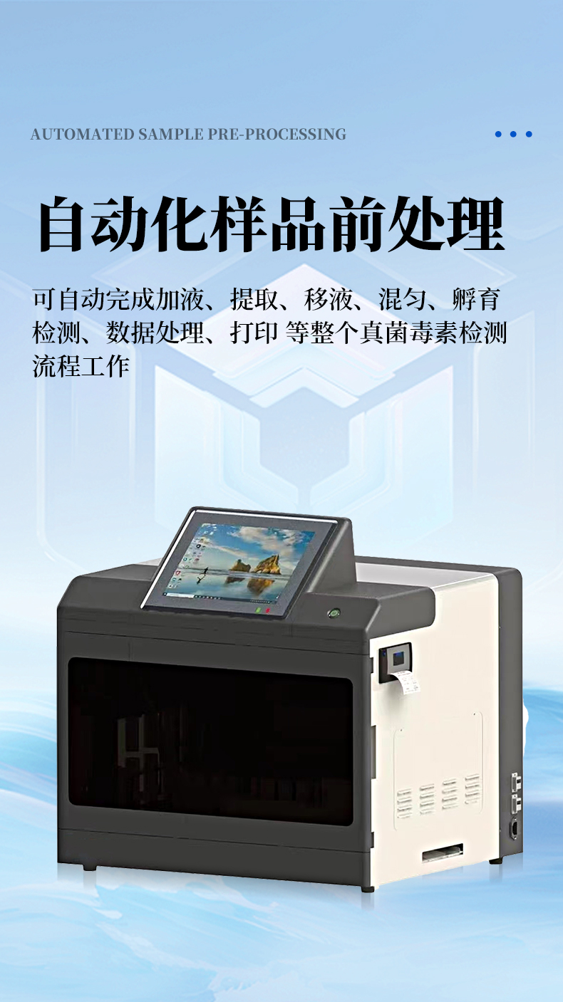 全自動真菌毒素檢測儀簡述: 本產(chǎn)品是以真菌毒素分析前處理技術(shù)開發(fā)的全自動檢測儀,可自動完成提取、混勻、移液、孵育、檢測、數(shù)據(jù)處理、打印等全流程工作。該儀器基于光電檢測原理的免疫熒光檢測技術(shù),配套專用熒光免疫試劑,通過自動化樣品前處理替代人工操作,可檢測黃曲霉B1、嘔吐毒素等多種