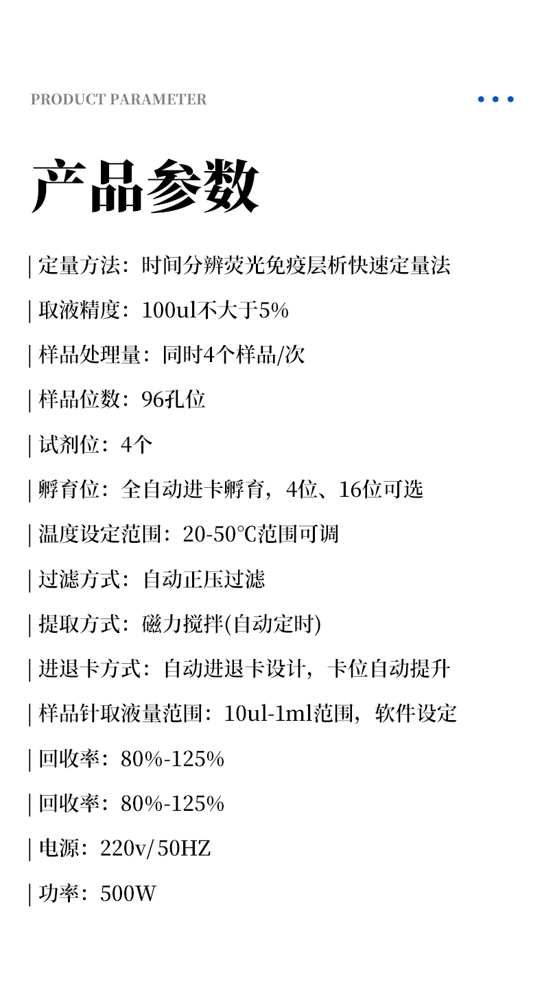 | 5、樣品位數(shù):96孔位; | 6、試劑位:4個; | 7、孵育位:全自動進卡孵育,4位、16位可選; | 8、溫度設(shè)定范圍:20-50℃范圍可調(diào); |