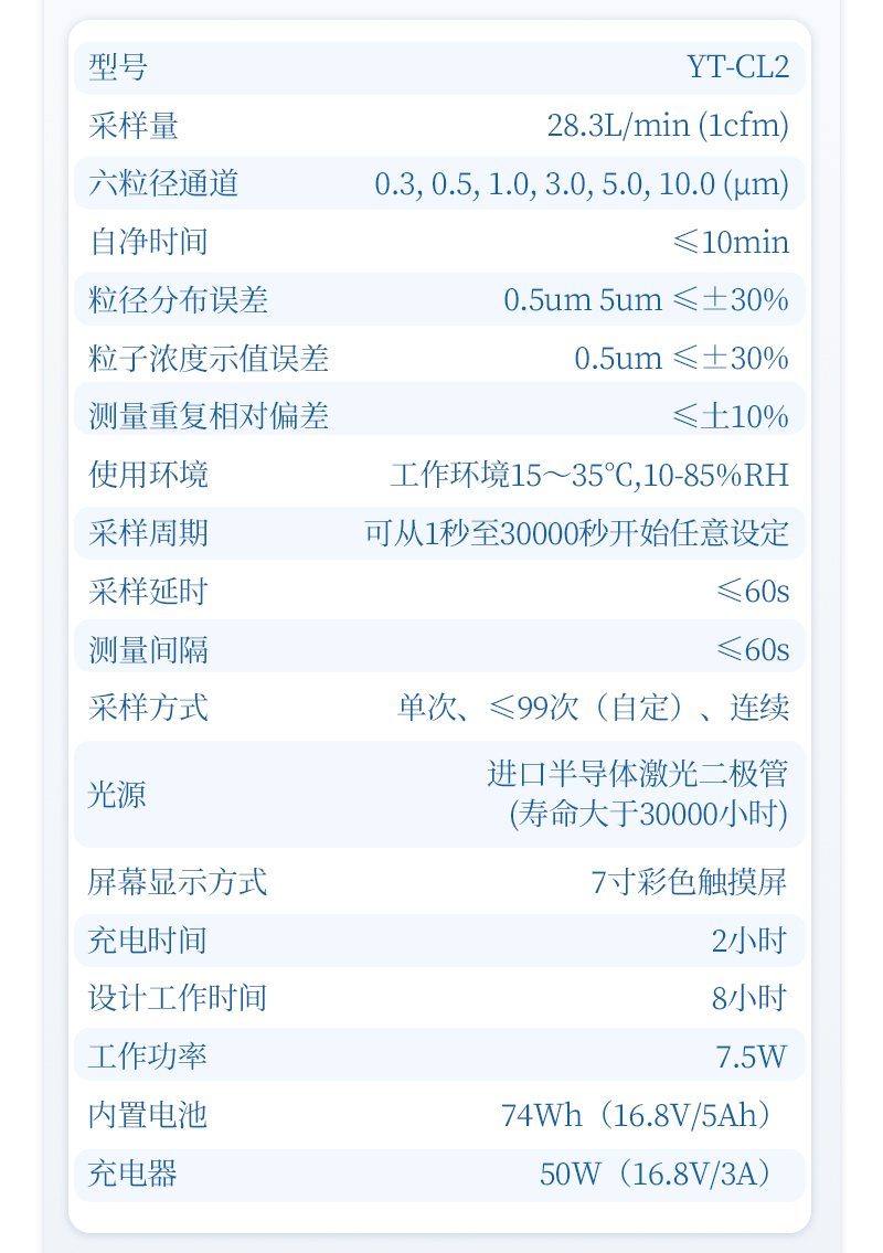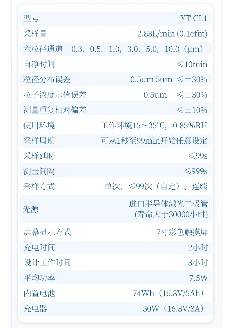 3、粒子計數(shù) 粒徑通道:0.3μm、0.5μm、1.0μm、3.0μm、5.0μm、10μm 最大采樣濃度:35000顆/升(顆粒物粒徑≥0.5μm) 重復性相對誤差:<10% 粒徑分布誤差:0.5μm粒徑擋分布誤差±30% |