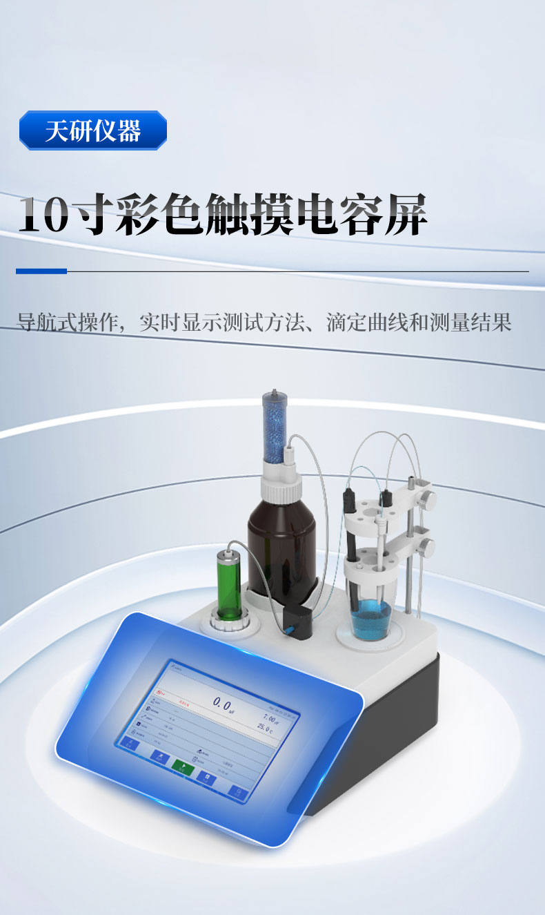 2. 10 寸彩色觸摸電容屏,導(dǎo)航式操作,實(shí)時(shí)顯示測(cè)試方法、滴定曲線和測(cè)量結(jié)果。